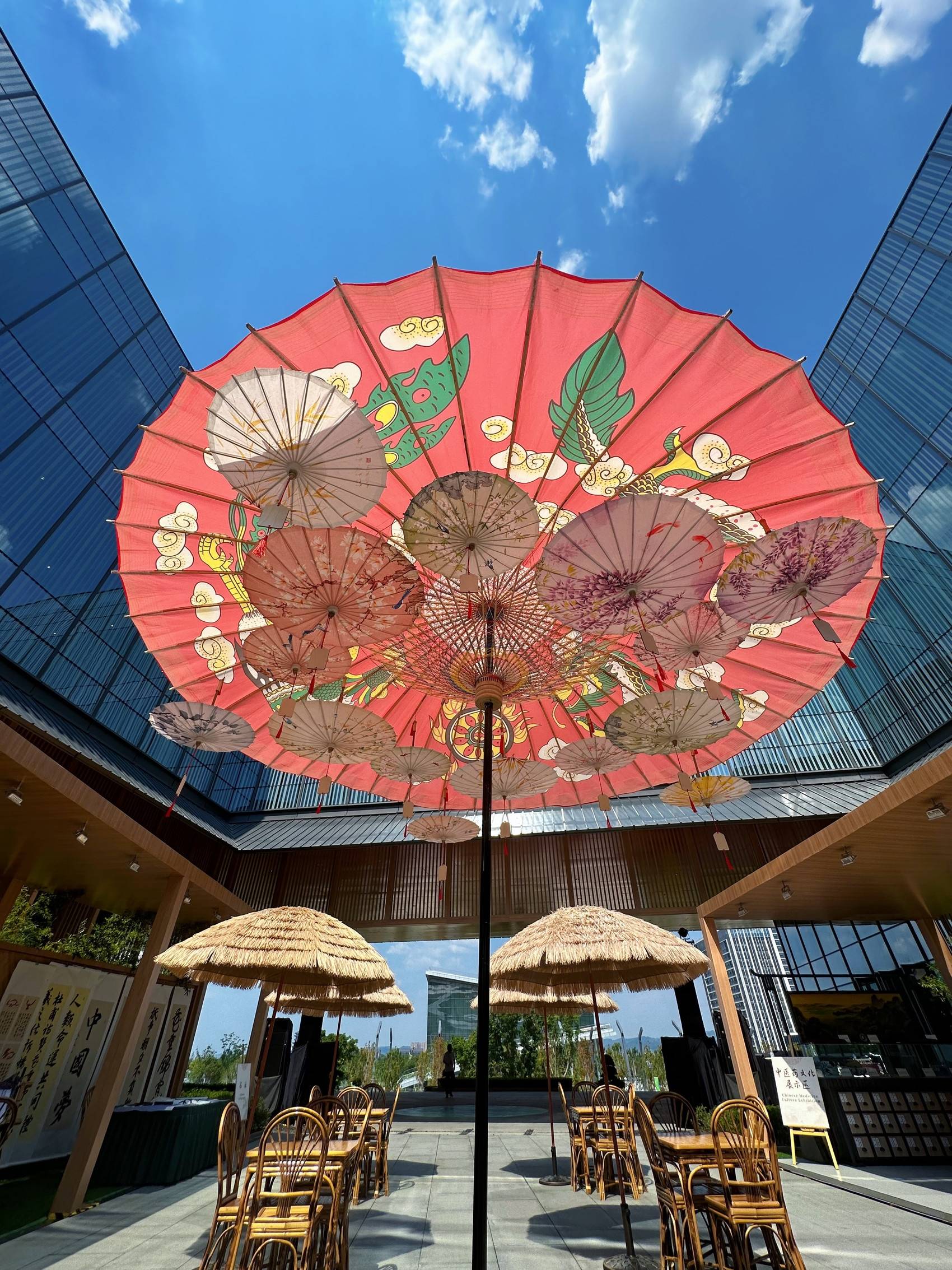 在主媒体中心二楼平台的文化活动区,一把直径3.5米的泸州分水油纸伞瞩目亮眼。
