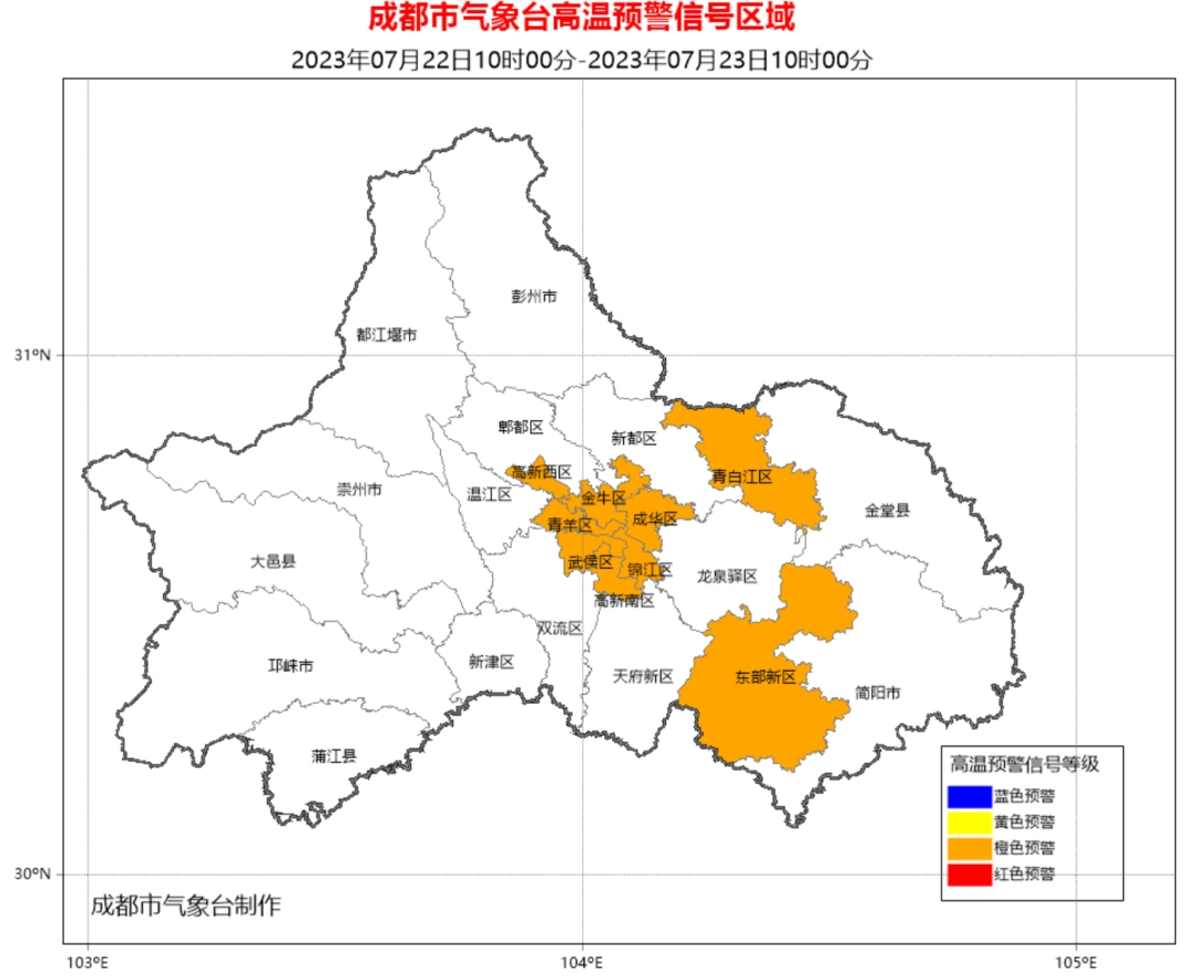 成都市气象台2023年7月22日10时00分发布高温橙色预警信号:预计我市武侯区、锦江区、青羊区、成华区、金牛区、青白江区、高新南区、高新西区和成都东部新区的所有乡镇(街道)未来24小时内最高气温将升至35℃以上。高温时段主要出现在今日13时至18时。请注意防范高温带来的不利影响。