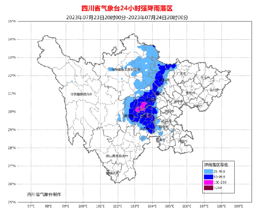 7月23日20时到24日20时,四川有一次雷雨或阵雨天气过程,雷雨时伴有短时阵性大风。其中,成都、雅安、眉山、乐山4市大部和广元、绵阳、德阳3市西部有大雨到暴雨(雨量60~80毫米),局部地方有大暴雨(雨量150~200毫米),最大小时雨量60~80毫米;阿坝州东部有大雨到暴雨(雨量25~60毫米)。