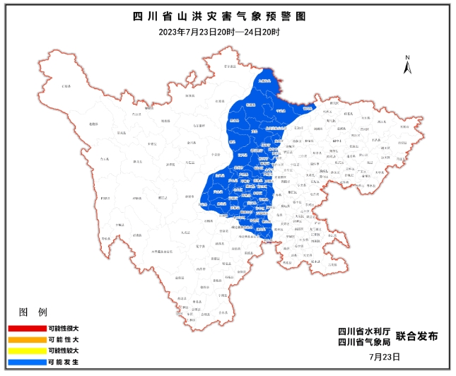 7月23日17时,水利厅、四川气象局联合发布山洪灾害蓝色预警。