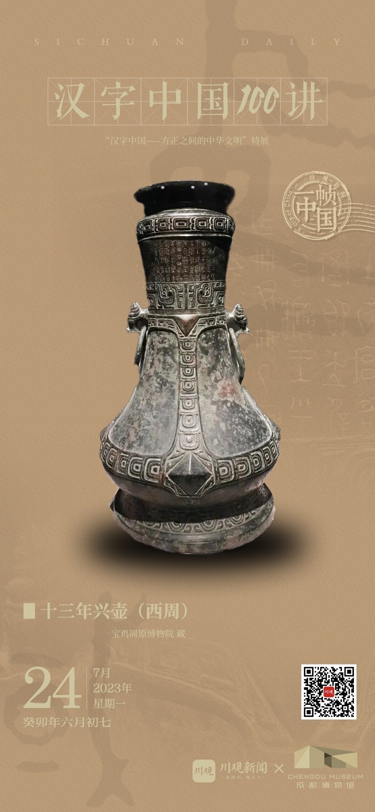 十三年兴壶长颈,扁腹,龙首衔环,颈饰凤鸟纹,盖缘和腹部饰鳞纹,盖顶饰长冠凤鸟,圈足饰波曲纹。盖榫和颈外壁同铭文56字,大意为十三年九月戊寅日,父陪同在成周的师徒淲宫入见周王,接受命服的册赐。此壶为懿王十三年铸器。