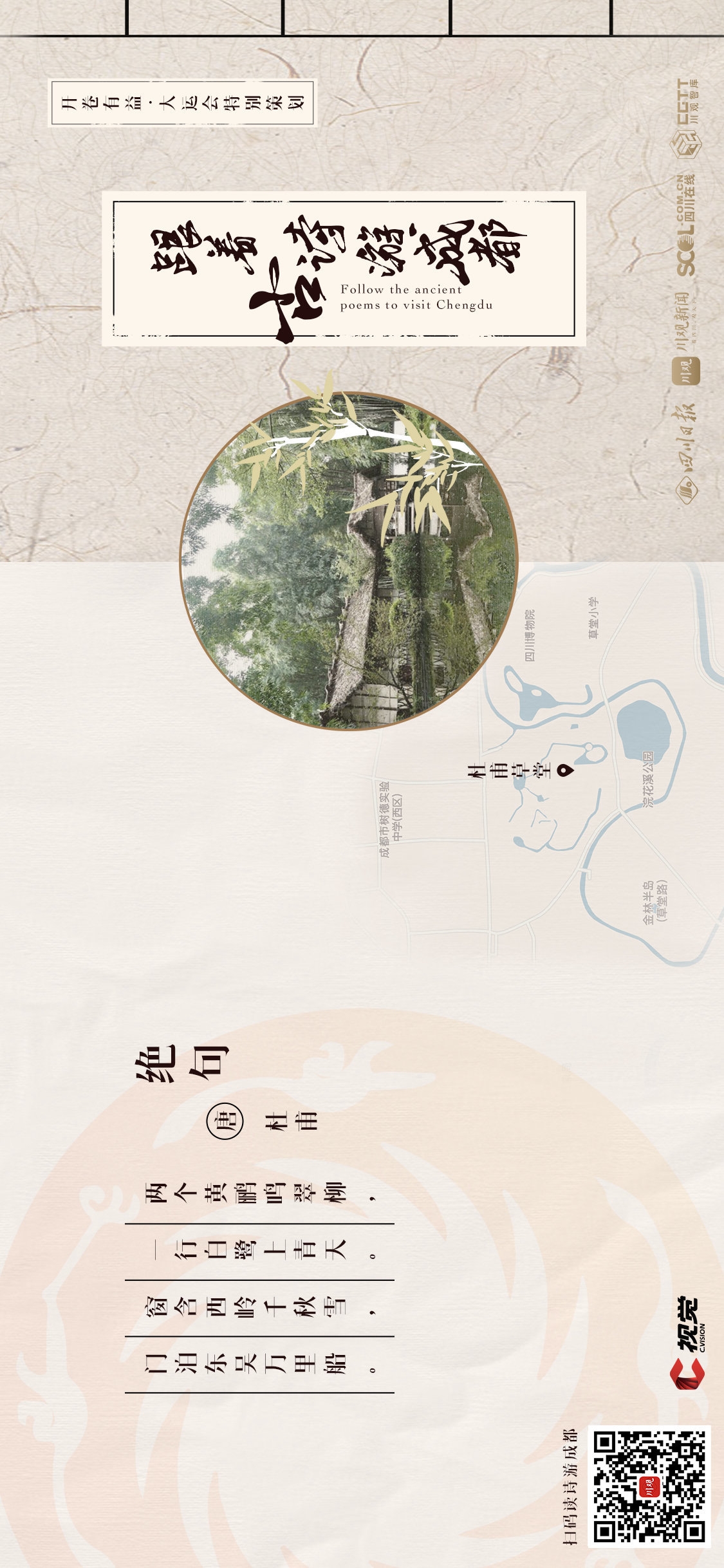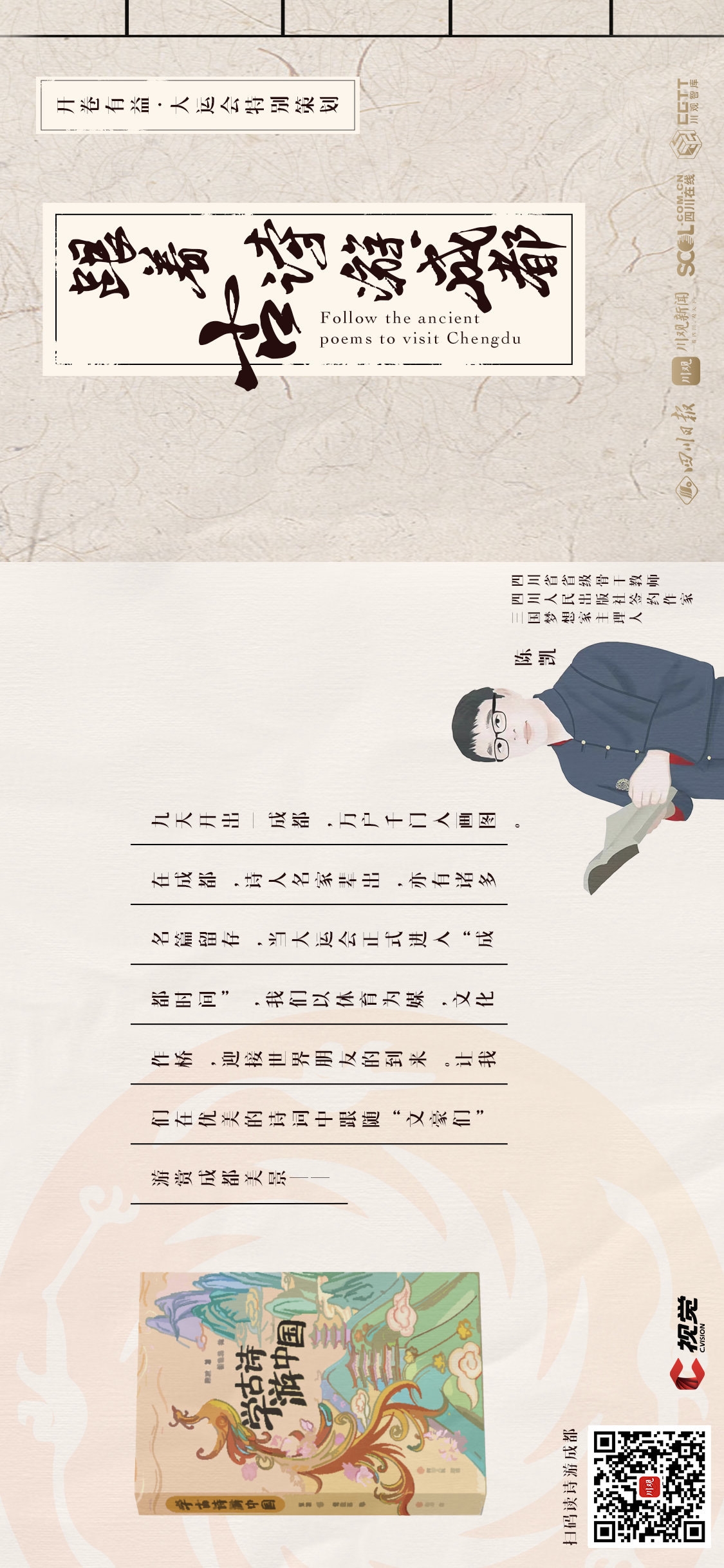 古代文人们最喜欢的成都美景是哪些呢?“锦江近西烟水绿”、“锦官城外柏森森”、“窗含西岭千秋雪”都是哪些著名景点呢?本期《开卷有益·川观荐书》大运会特别策划,我们邀请了四川省省级骨干教师、四川人民出版社签约作家、三国梦想家主理人陈凯老师,在他的新书《学古诗 游中国》成都篇里,三位古代文豪就担起了“导游”,带领我们一同来游赏成都的美景——