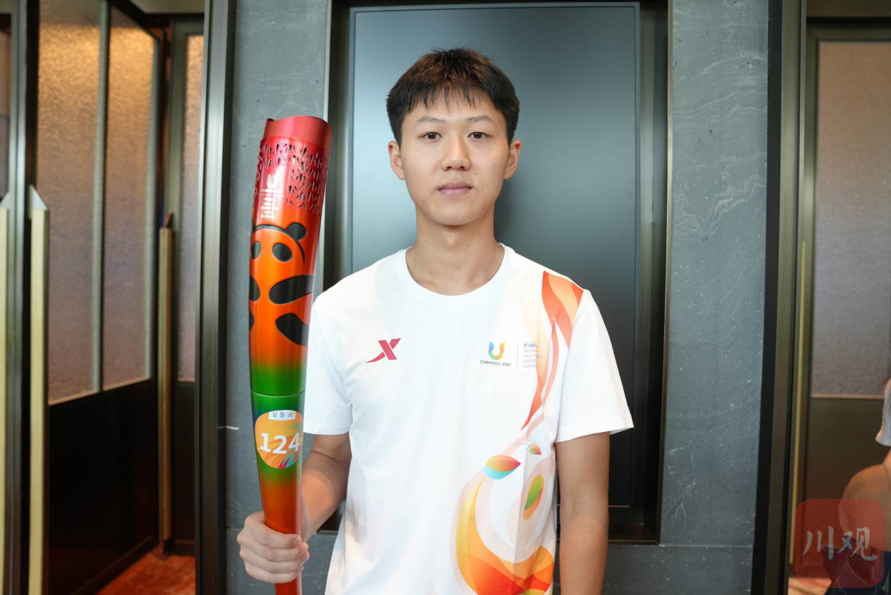 7月26日,在成都第31届世界大学生夏季运动会火炬传递成都站(东安湖体育公园)活动现场,第124棒火炬手樊添瑞高擎火炬迎面而来,完成了火炬传递成都站(第五日)最后一个站点的火炬传递。