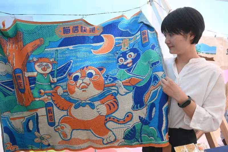 南京市博物总馆产业发展部文创服务办副主任谢宇萌介绍,这件文创产品根据南京市博物馆的镇馆之宝——元青花萧何月下追韩信图梅瓶图案创作。“不过我们将其做成了像素风格,并把原图案中的所有人物变成了当代年轻人喜欢的喵咪形象,用色大胆鲜艳。”谢宇萌介绍,因为此次成都大运会青春特色鲜明,所以他们专门带来了这件年轻化表达的文创产品。