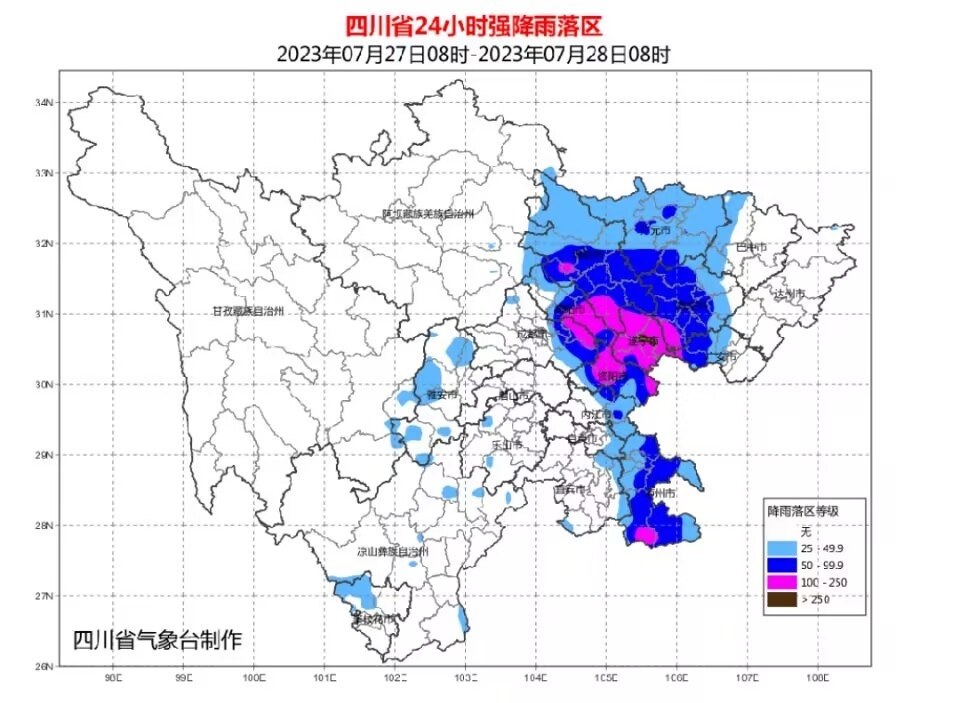 四川省气象台2023年7月27日7时将暴雨蓝色预警升级为暴雨黄色预警:7月27日08时到28日08时,四川省有一次雷雨或阵雨天气过程,雷雨时伴有短时阵性大风,其中绵阳、德阳、遂宁、资阳、南充、泸州6市和广元市南部、广安市西部及成都市东部的部分地方有暴雨(雨量50~80毫米),局部地方有大暴雨(雨量120~200毫米),个别站点可超过250毫米,最大小时雨量40~70毫米 。