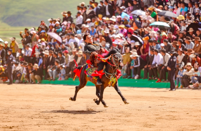 7月17日上午,甘孜县来马镇会师走马场上的“走马”表演活动,吸引了省内外众多游客前来观赏。(洛绒尼玛 摄)