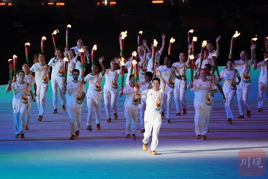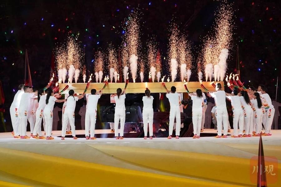 7月28日晚,成都第31届世界大学生夏季运动会开幕式现场,31名火炬手共同点燃大运会主火炬。