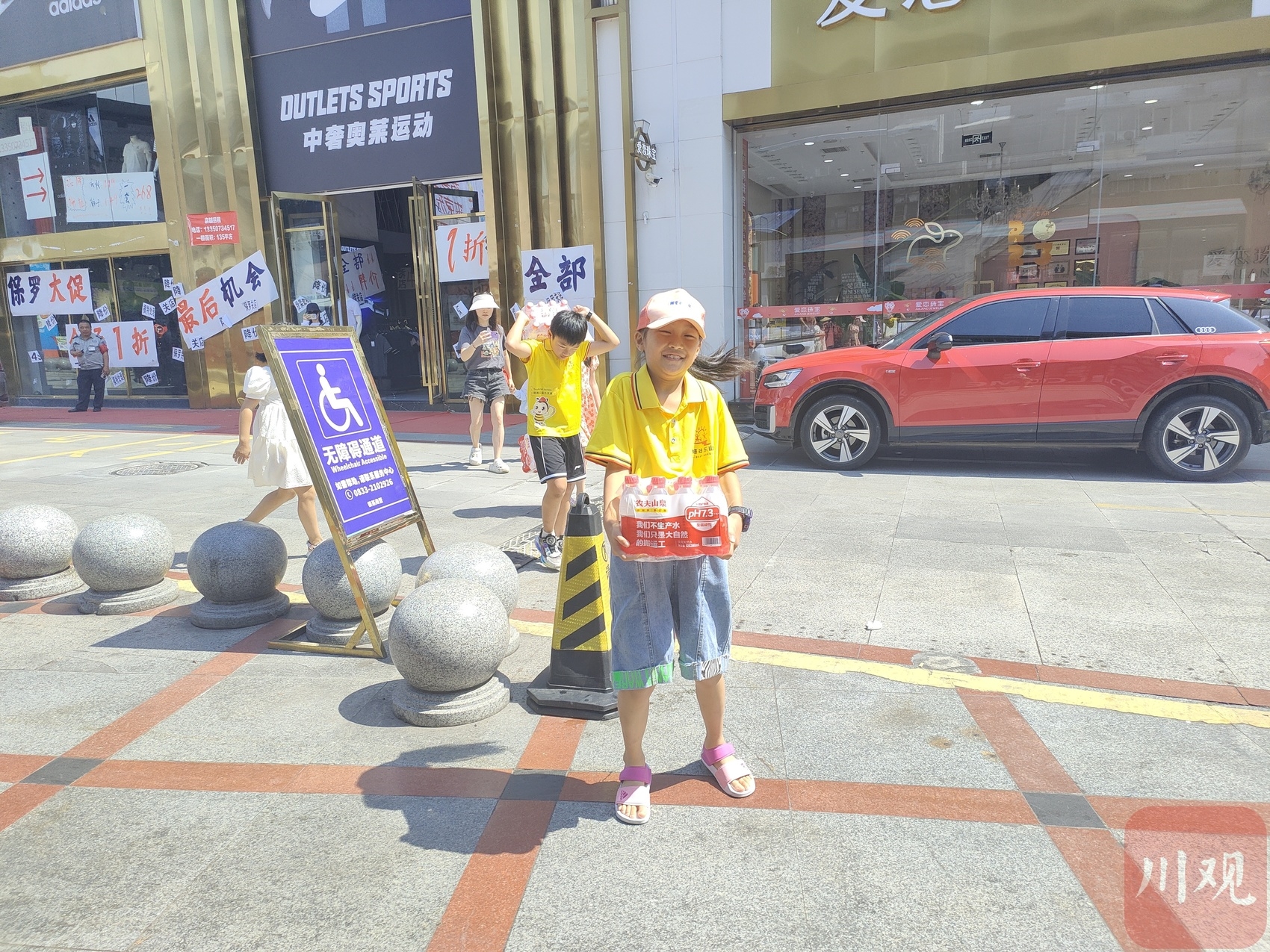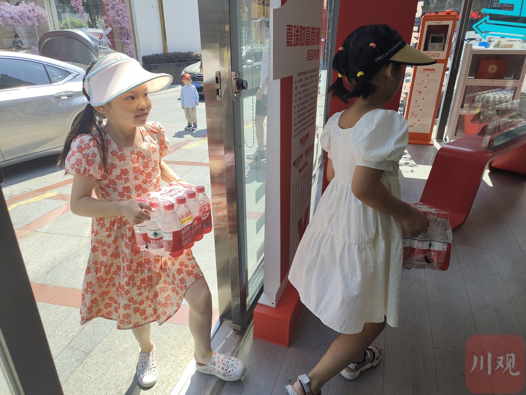 孩子们向爱心冰柜捐赠矿泉水。