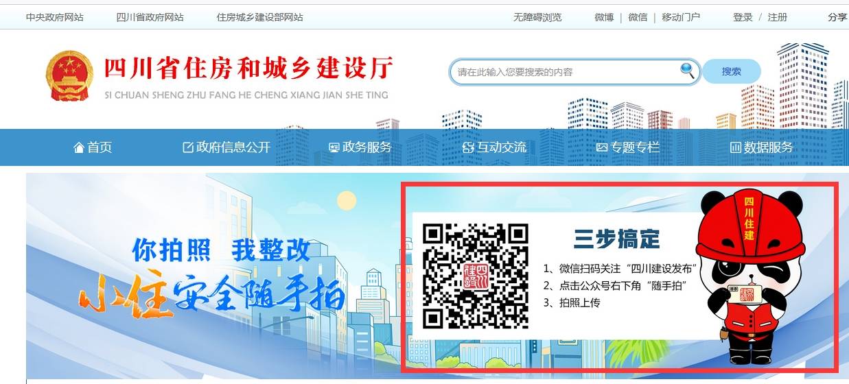 打开四川省住房和城乡建设厅官方网站(http://jst.sc.gov.cn/) ,点击“小住安全随手拍”专栏;