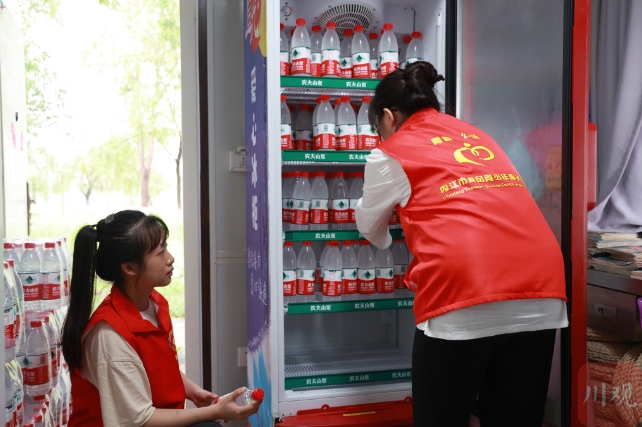 本次落地的“爱心冰柜 清凉接力”的公益活动由川观新闻联合内江市精神文明建设办公室共同发起,“爱心冰柜”及饮品均由农夫山泉公益赞助,首批清凉饮品已投放到内江市市中区大洲广场志愿服务V站,将为户外工作者免费提供清凉饮品。