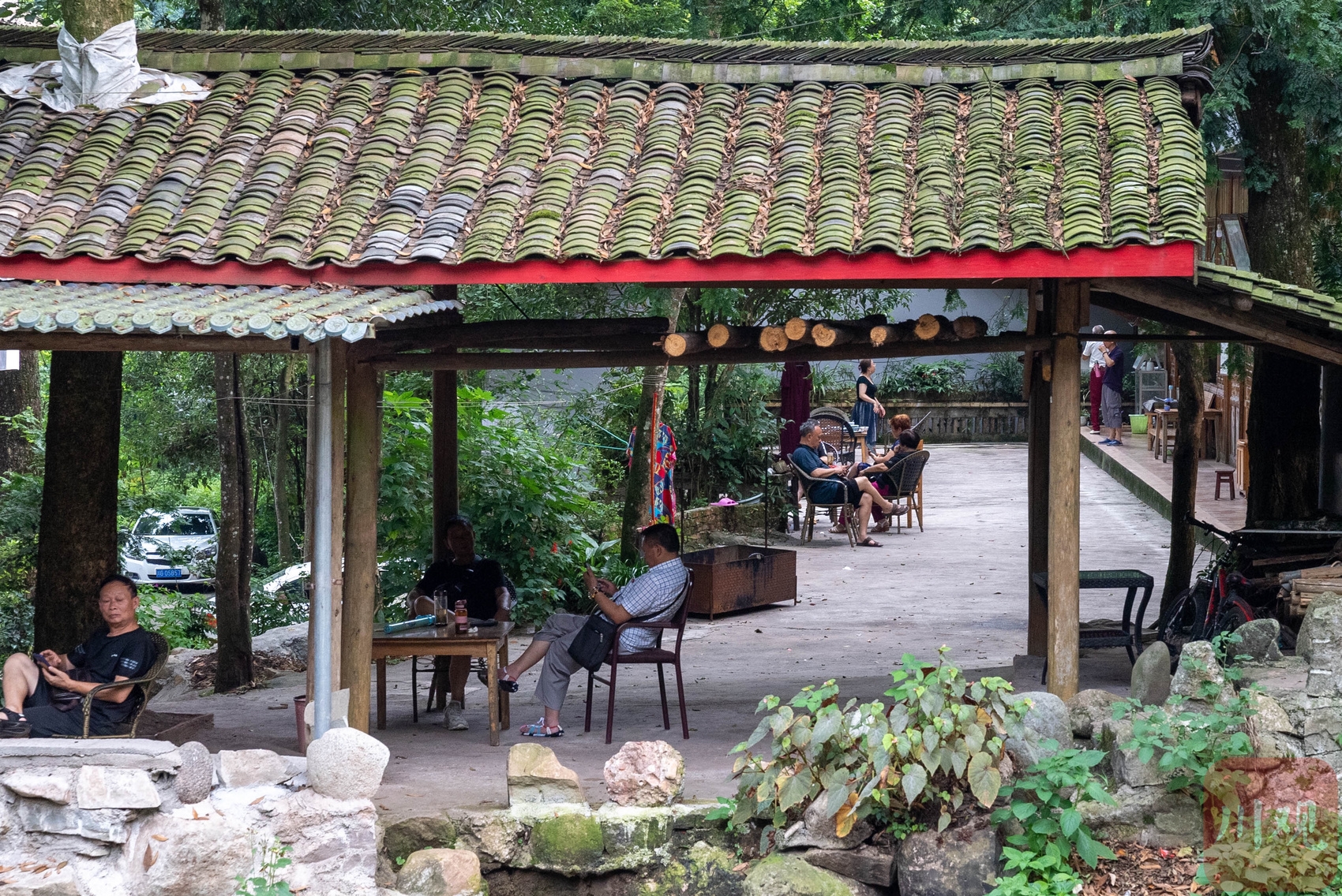 楠木溪宽不过两三米,溪水潺潺,溯流而上格外凉爽,溪流两旁农家乐林立。正是避暑季,道路旁停放着游客车辆。