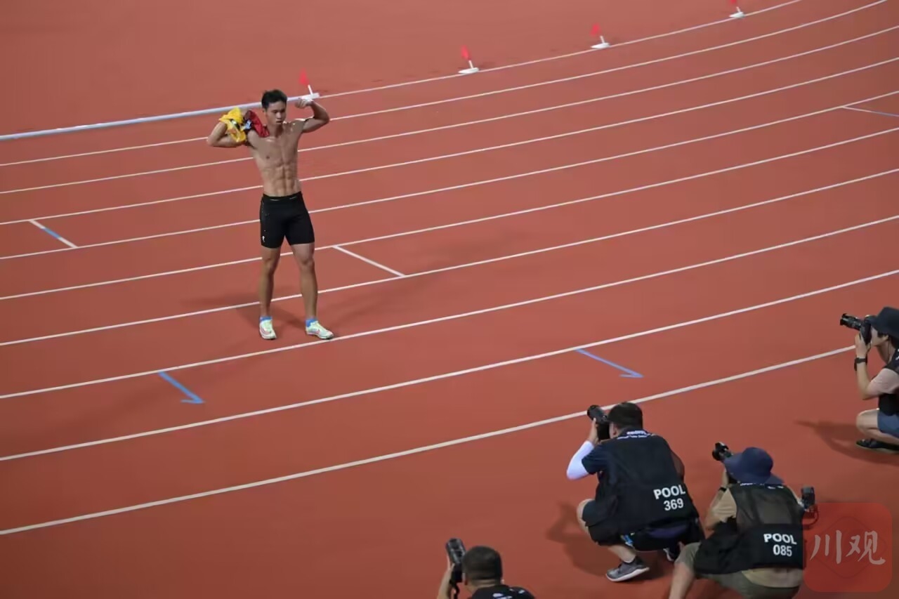 8月3日晚,双流体育中心体育场,男子十项全能比赛结束后,完赛的10名选手举行了赛后的标志性庆祝仪式——脱衣合影。中国选手陈业森作为完赛选手也参与了合影。