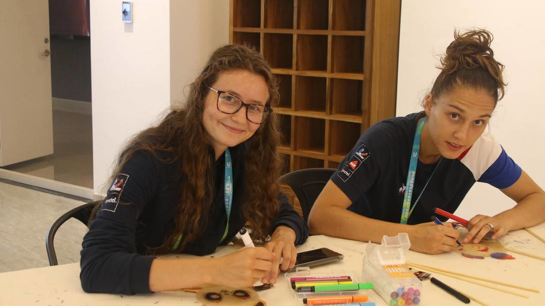 8月3日晚8点,法国运动员巴塔雷利在吃过晚餐后和她的新朋友艾丽一起来到皮影体验室,画“蓉宝”、演皮影,“太神奇了!”巴塔雷利在老师的教学下,甩起了手中的棍儿,“蓉宝”也在动感十足的音乐中跳起了“迪斯科”。“太可爱了,我想把它带回家!”