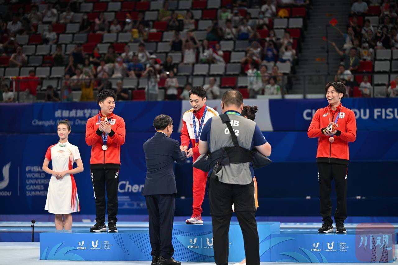 邹敬园在发现父亲的身影时,还不忘介绍给一旁的日本队选手杉本海誉斗,颁奖嘉宾是自己的父亲。这样暖心的一幕,也为成都大运会体操比赛画上温暖句号。