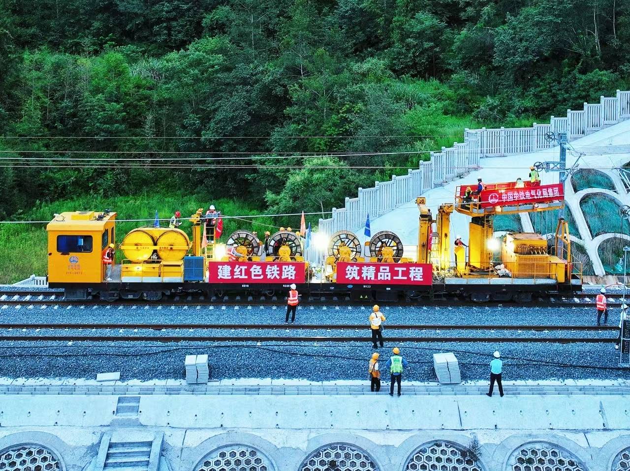施工人员正在进行首条接触网导线起锚施工作业。中国中铁电气化局供图