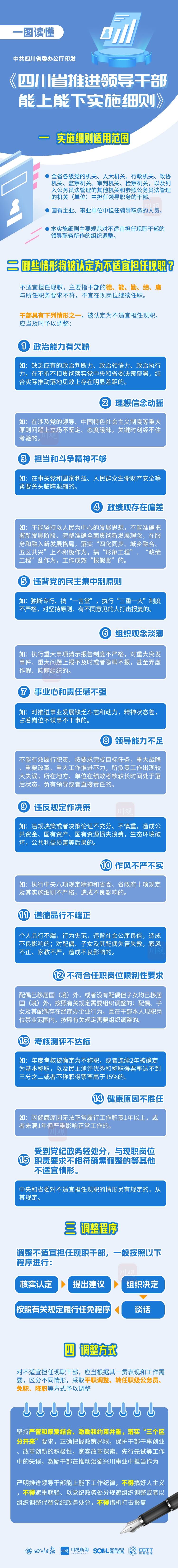 近日,省委办公厅印发了修订后的《四川省推进领导干部能上能下实施细则》,并发出通知,要求各地、各部门认真遵照执行。