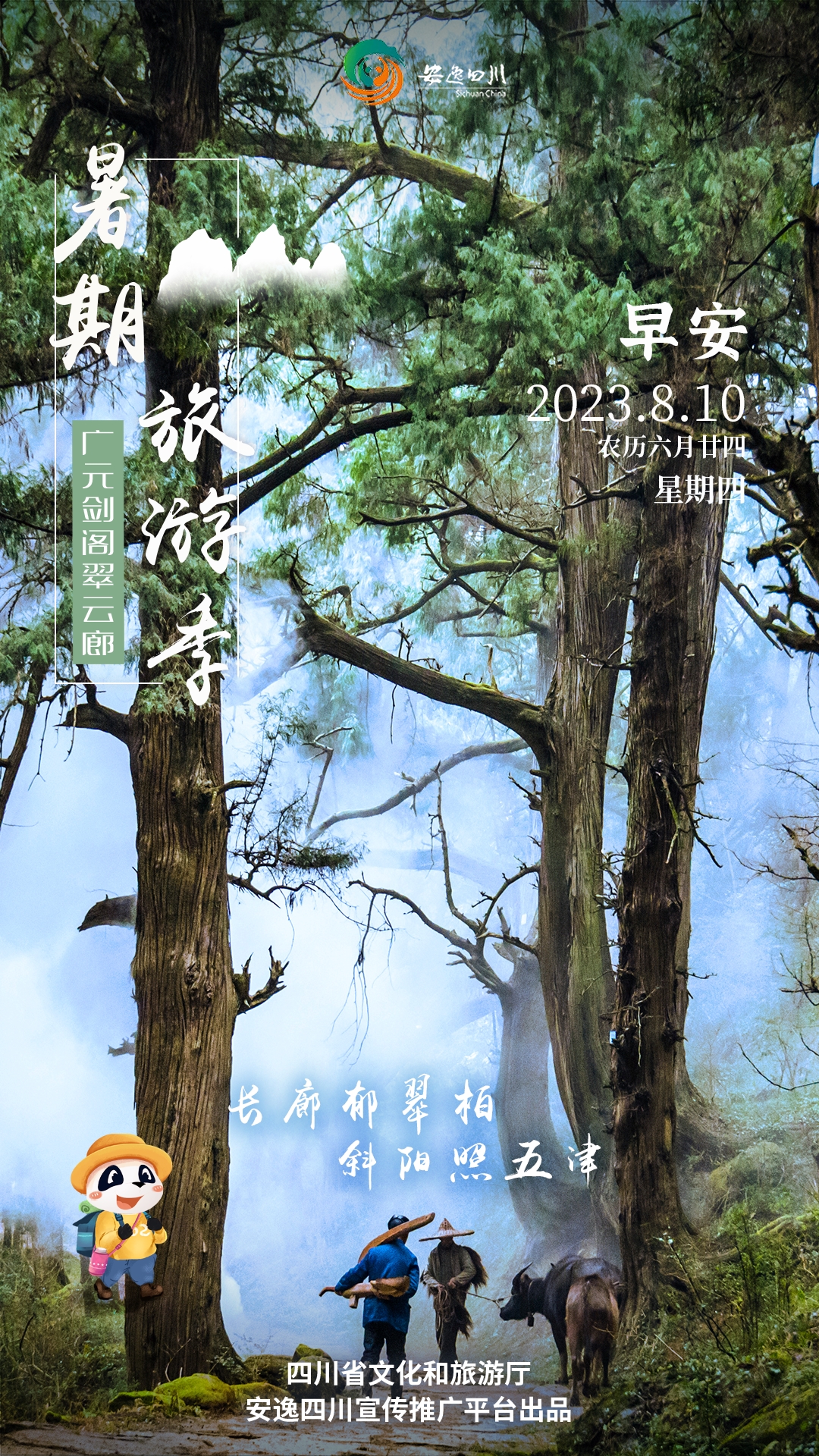 8月10日,星期四。今日安逸四川日历海报走进广元剑阁翠云廊,看目前存世时间最长、面积最大、数量最多的人工行道古树群。