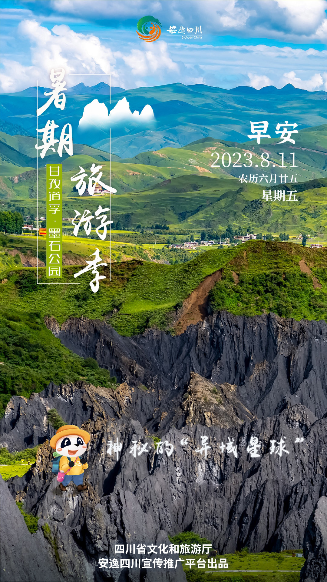 8月11日,星期五。今日安逸四川日历海报“暑期旅游季”走进甘孜道孚墨石公园,感受神秘地质景观。