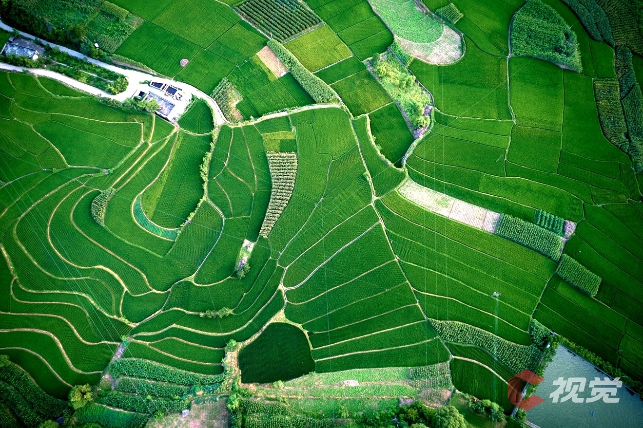 从空中俯瞰, 一幅阡陌纵横、青翠宜人的生态田园画卷徐徐展开。