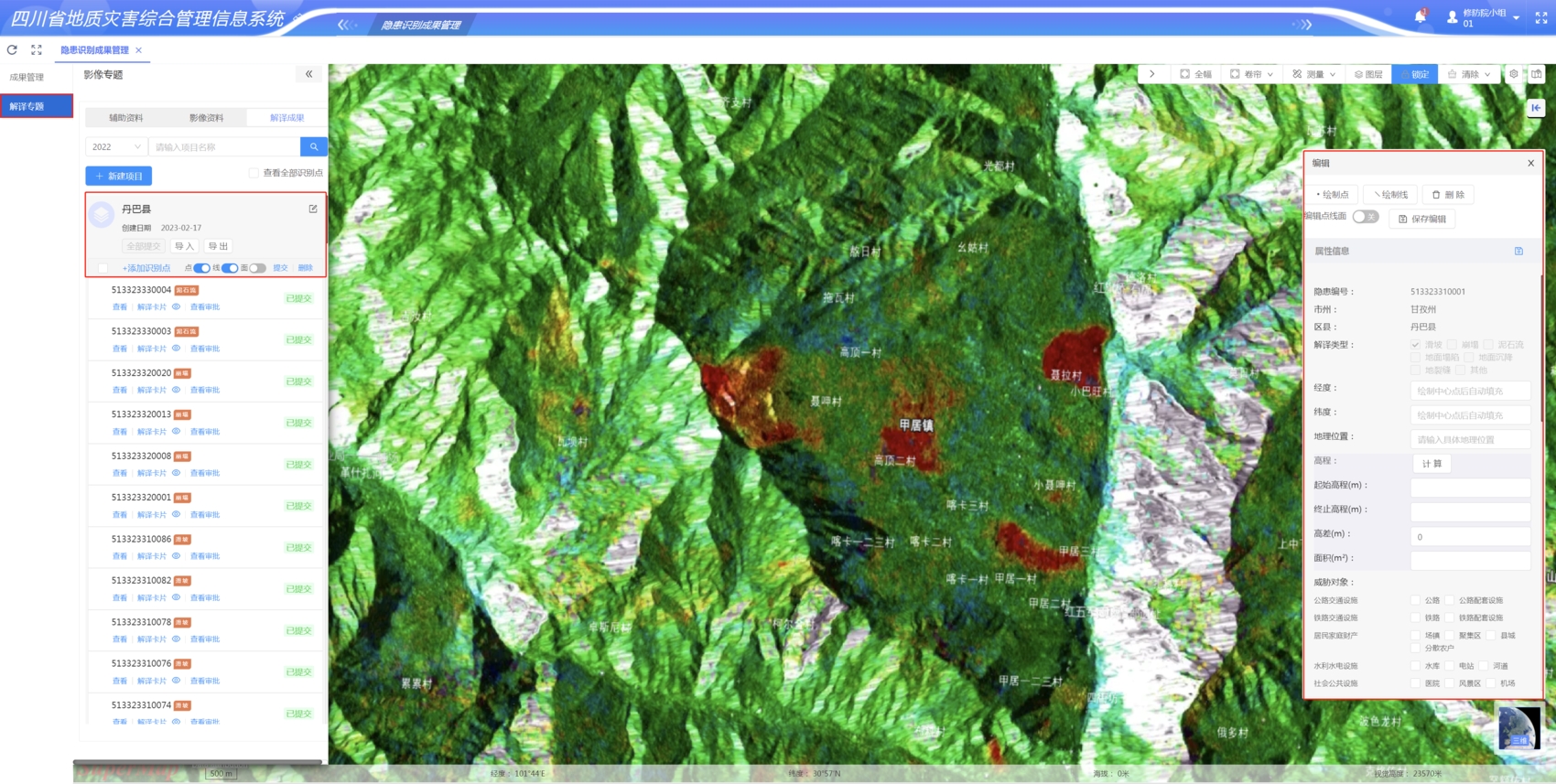 “依托省级早期识别分析中心建设,3年来我们逐步实现了隐患识别成果管理、三维遥感解译、空间分析等信息化平台管理功能。同时,将地灾隐患识别成果与四川省地质灾害隐患基础数据库进行关联,实现了遥感识别地质灾害隐患点动态更新,并对新增点逐一落实防灾措施。”打开地质灾害隐患识别成果管理系统,任娟随机在地图上选取一处隐患点,上面清晰展示着灾害体特征、受灾人数、附近基础设施等基本信息,以及识别成果生产全过程。