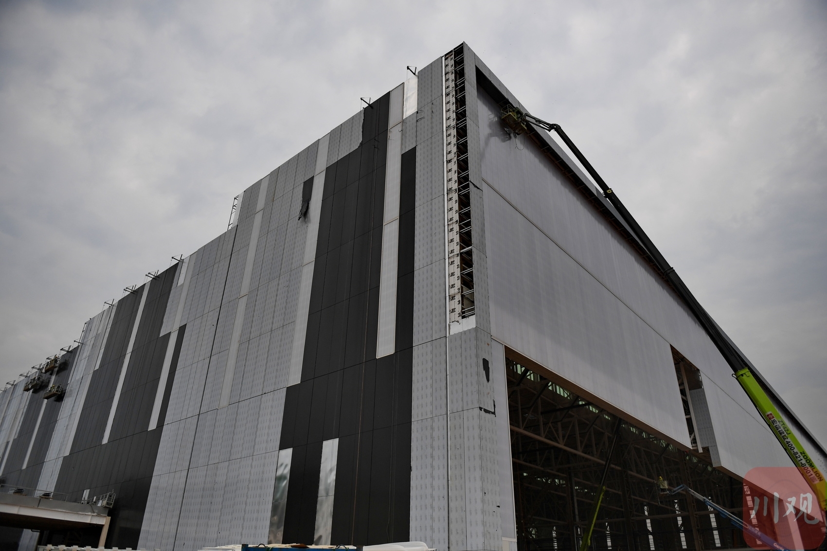 8月15日,在位于成都市双流区的空客飞机全生命周期服务中心项目建设现场,工作人员在进行机库大厅幕墙铝复合板施工。