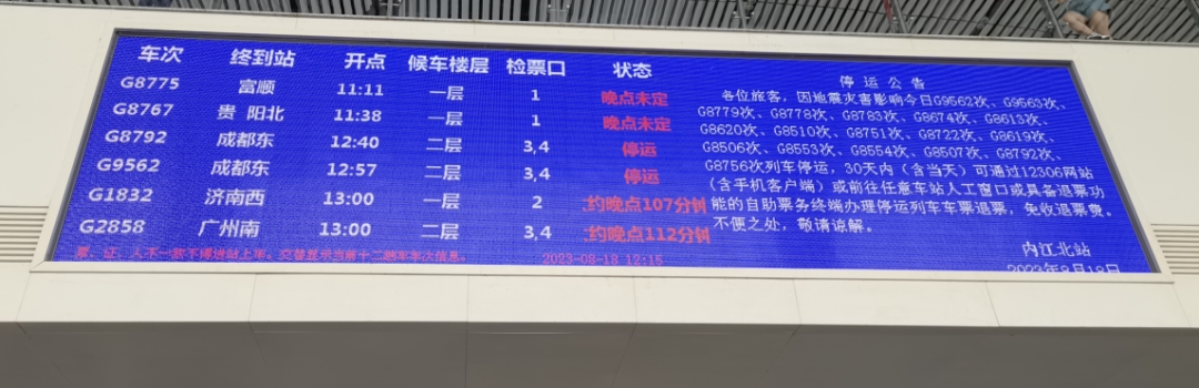 成都东、资中北、内江北、自贡等车站及时通过站内大屏幕、广播、微博等载体滚动播报列车晚点信息,组织人员对站内设备、悬挂物进行巡视检查,确保设备设施安全可靠。同时,组织人员支援退票窗口,做好旅客安抚解释退票等工作,积极向旅客宣传网上退票方法,帮助旅客快速办理退票。