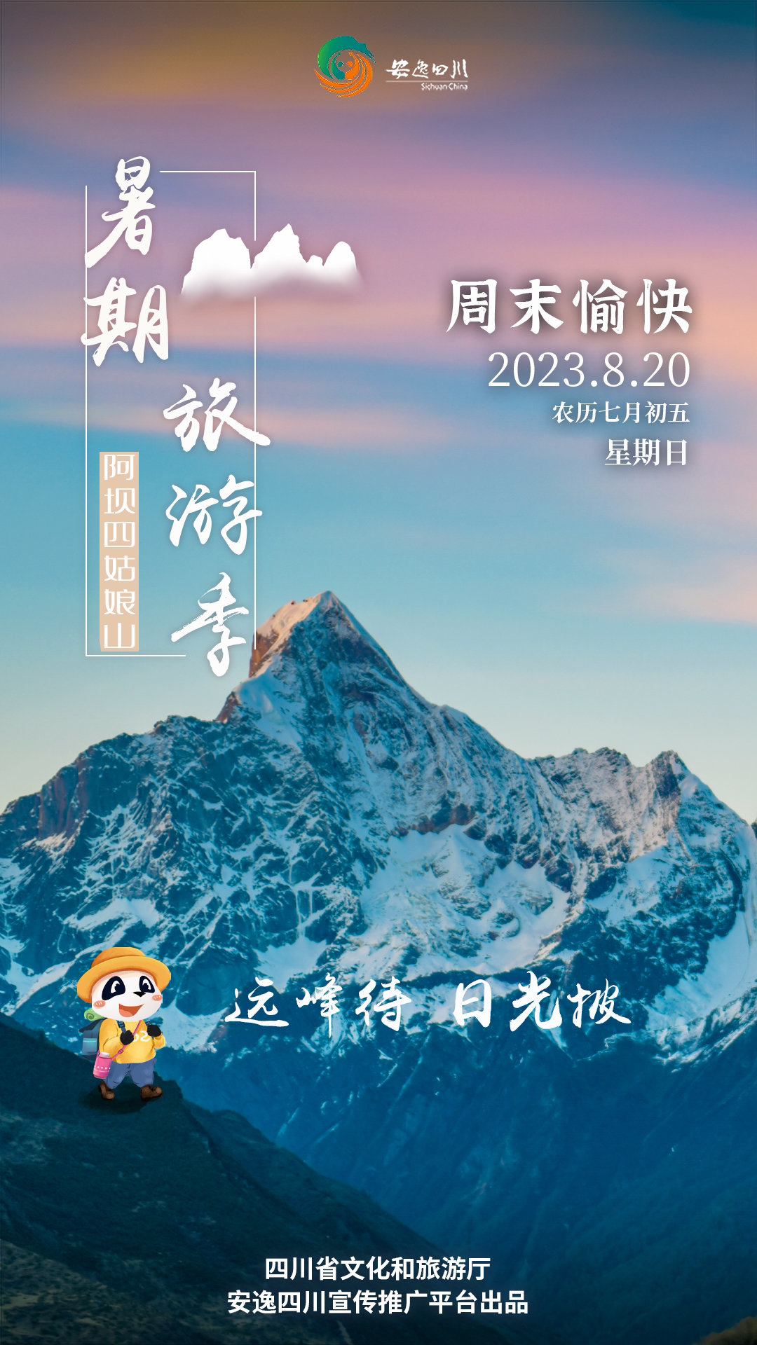 8月20日,星期日,周末愉快。今天安逸四川日历海报“暑期旅游季”走进阿坝州四姑娘山,感受远峰静待日光披的震撼美景。