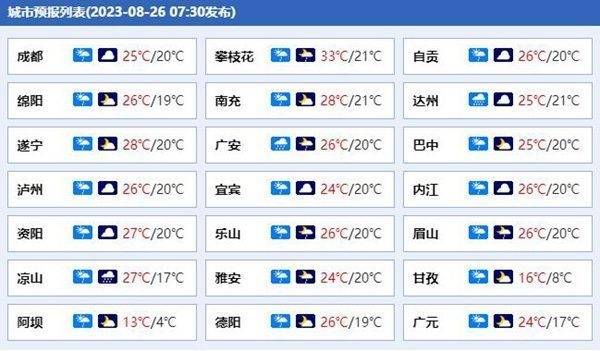 昨天,四川依然是雨水占据主场的一天,其中巴中、南充、遂宁、德阳等地雨水不断,部分地区还伴有短时强降水、雷电等强对流天气。气温方面,14时大部地区的气温都只有25℃上下,秋凉感明显。