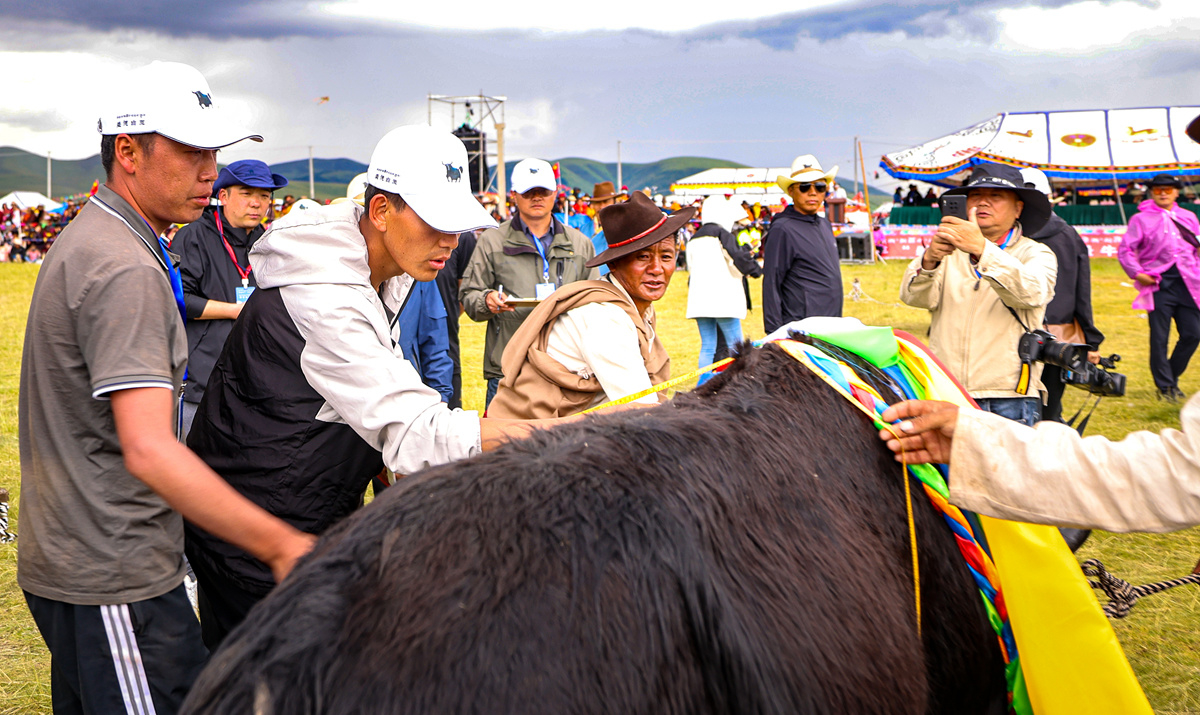 “我们的第一个考量标准就是体重。”白玉县农牧农村和科技局副局长冷安书告诉记者,对体重相同的个体,就依据体高、胸围等数据来综合判定优劣。经过角逐,来自安孜乡麻绒村的40号牦牛,以1080斤的体重,斩获了一等奖。
