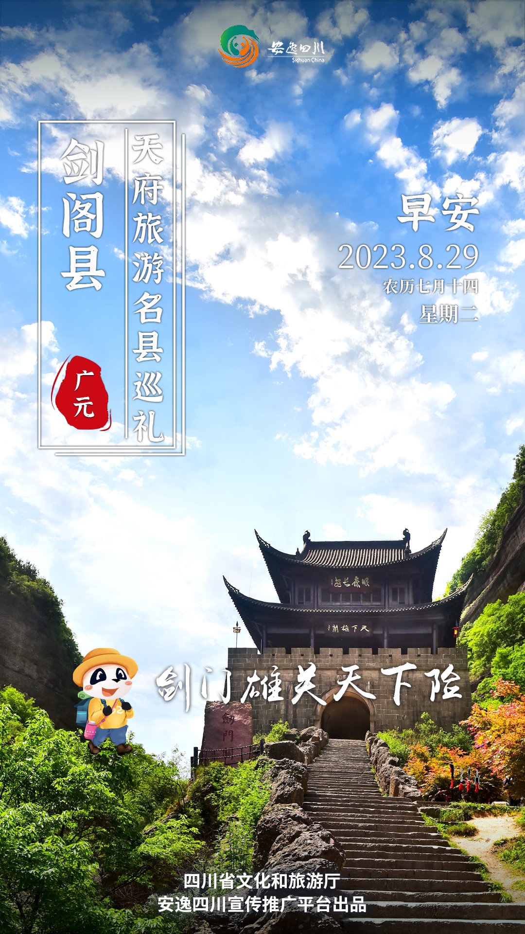 8月29日,星期二。今天安逸四川日历海报“天府旅游名县巡礼”走进广元剑阁县,感受“一夫当关,万夫莫开”的豪迈。
