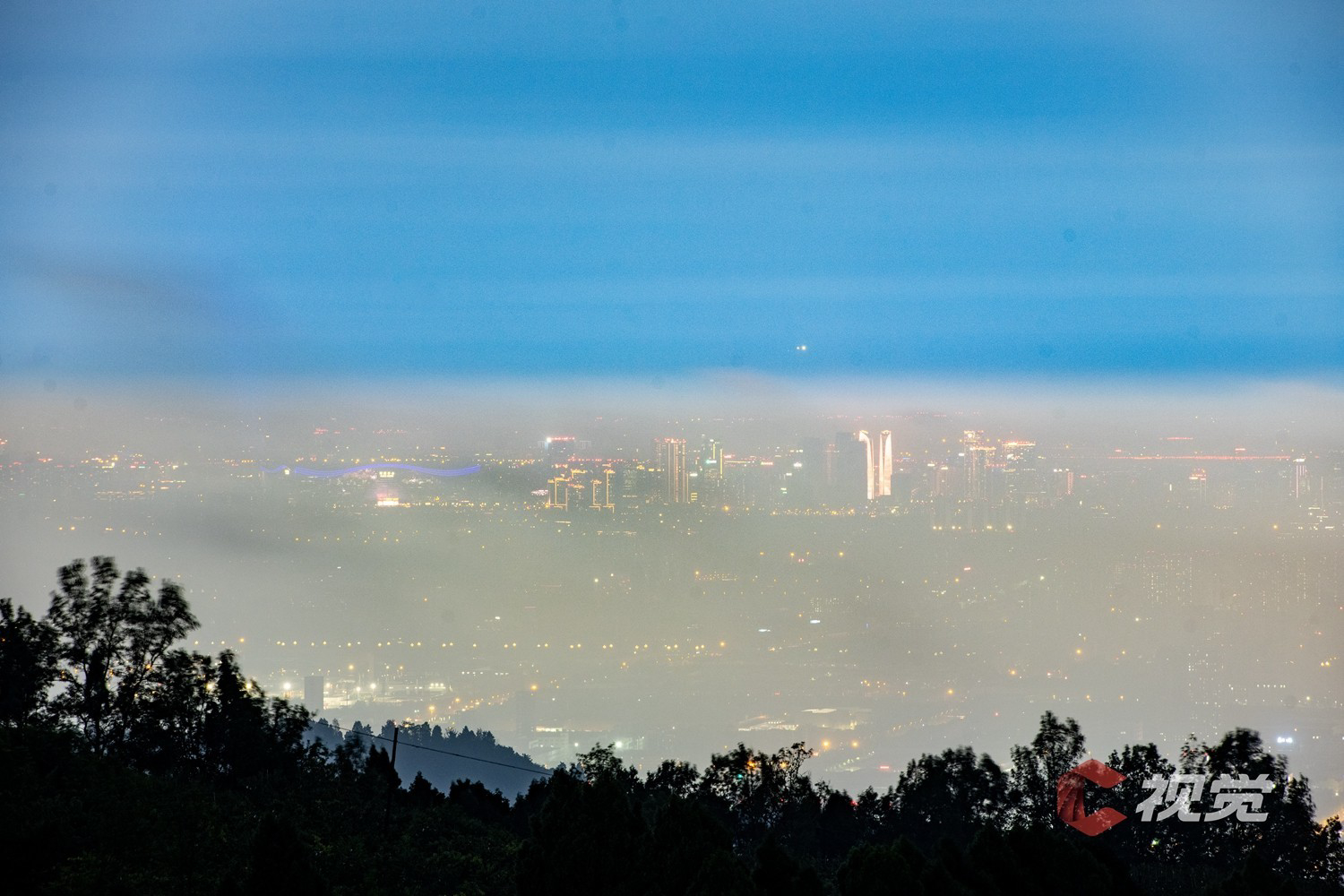 8月29日晚8时许,C视觉签约摄影师李思聪从龙泉山巅远眺成都市区,雨后的蓉城上空聚起一层云雾,灯火阑珊的“不夜城”展现出另一种美,朦朦胧胧,如梦似幻,仿佛海市蜃楼。