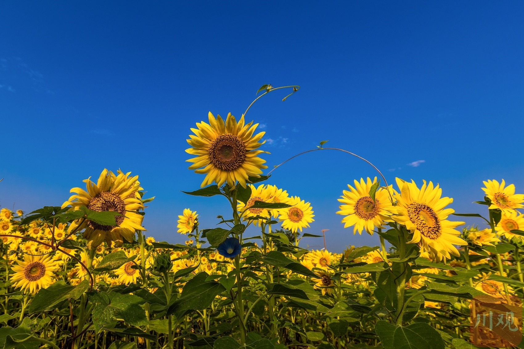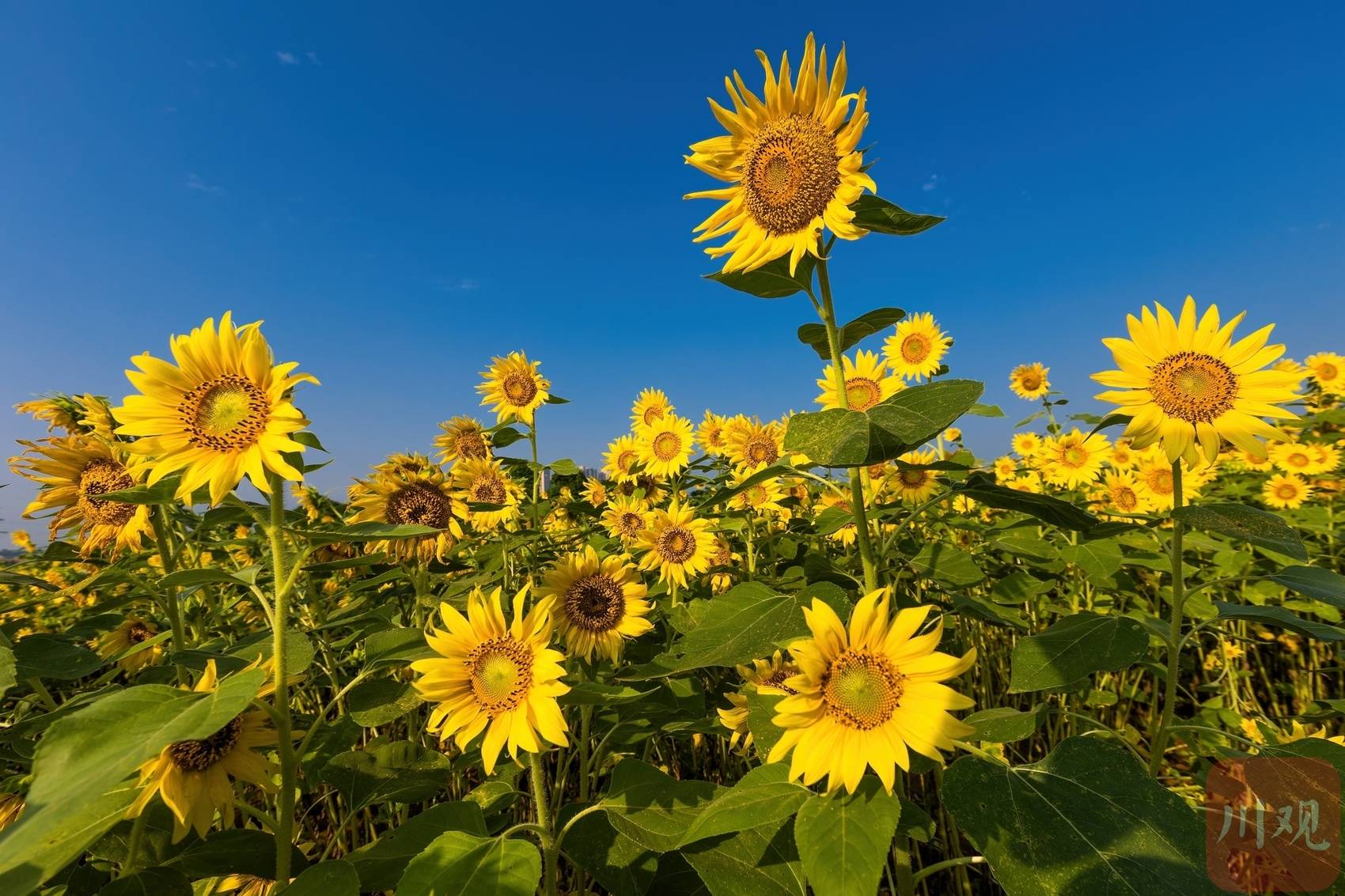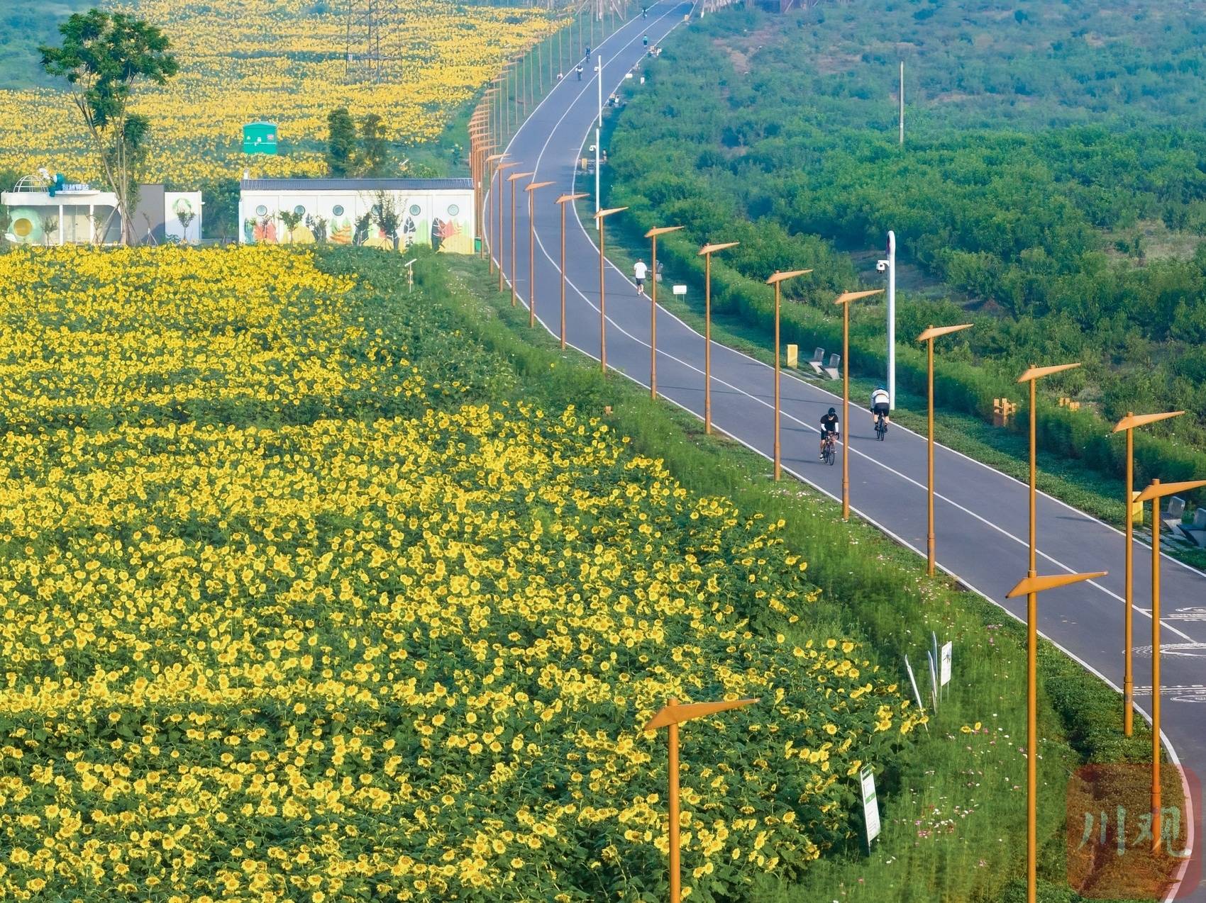 进入9月,夏天渐渐末了,秋天也如期而至,成都环城生态区“十万亩粮油产业带”的新都五龙山地块也成了一片黄色的海洋,金黄色的向日葵在蓝天白云的映衬下,甚是好看。早起的市民在绿道上骑行、散步,格外神清气爽。