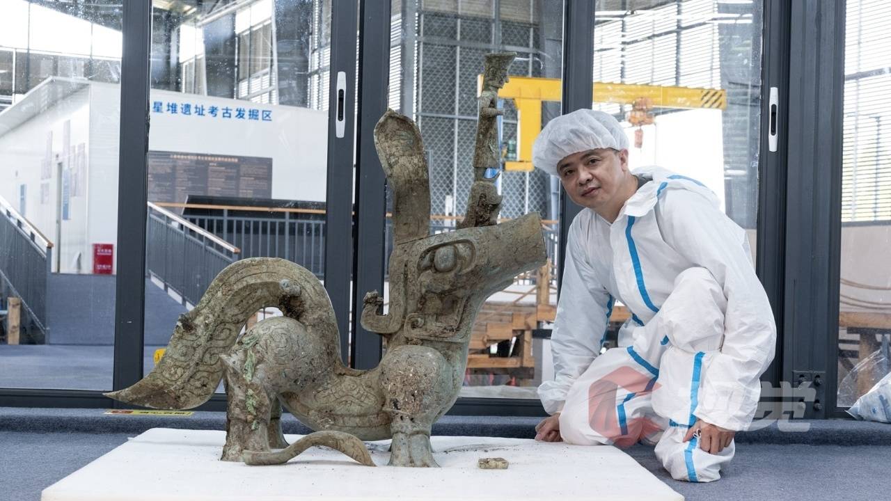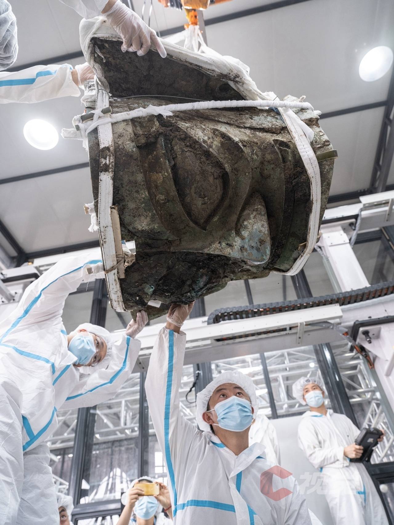 2021年6月23日,3号坑的青铜大面具提取“出坑”现场。