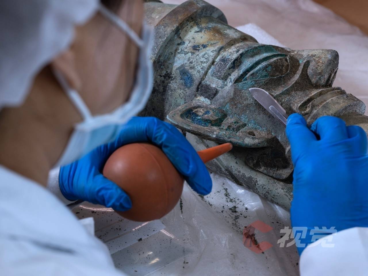 考古工作人员对青铜顶尊人头像进行进一步清理。