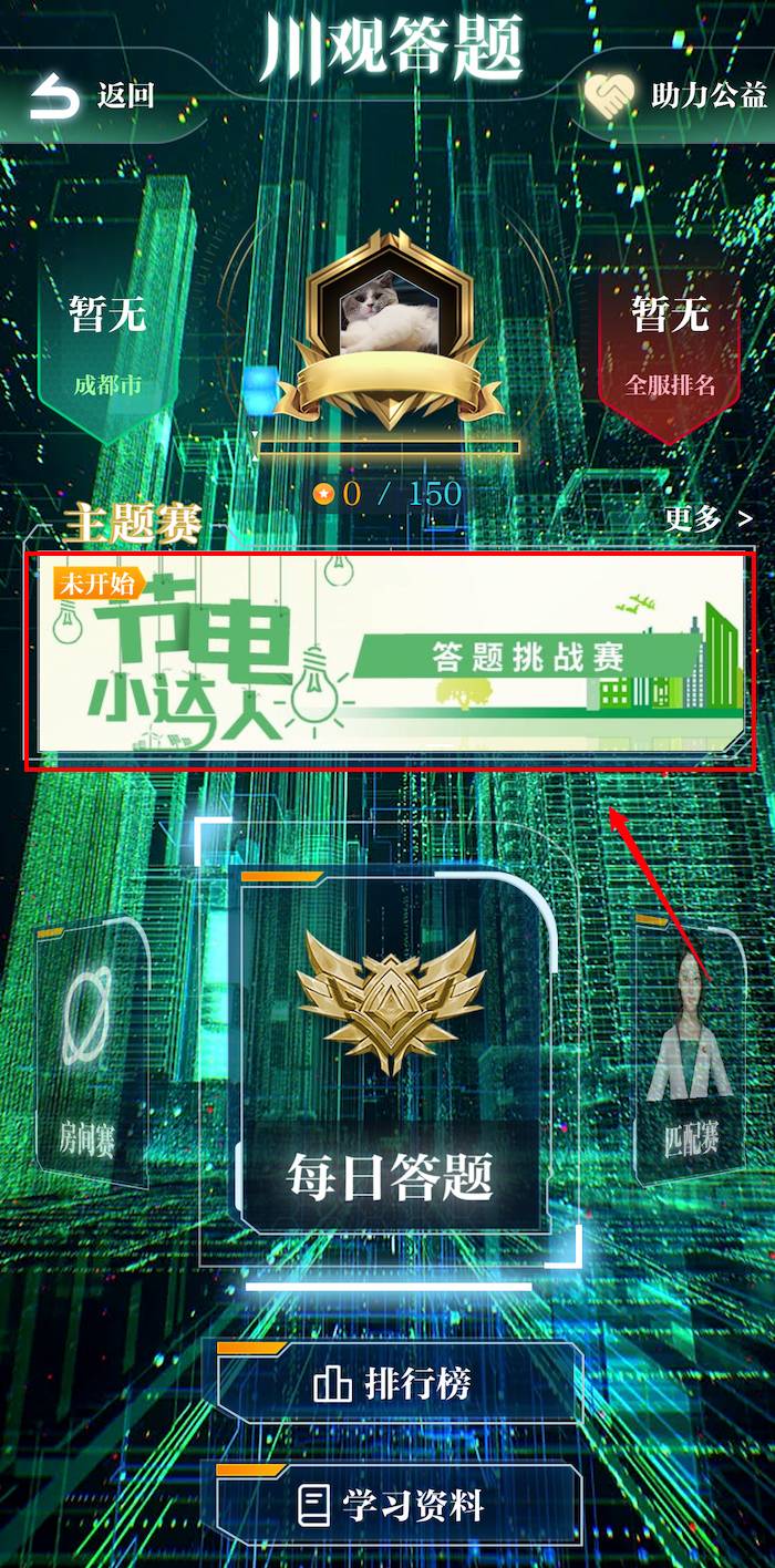 2、在川观新闻首页,点击“川观答题”,找到“节电小达人”挑战赛活动图片,点击即可参与答题;