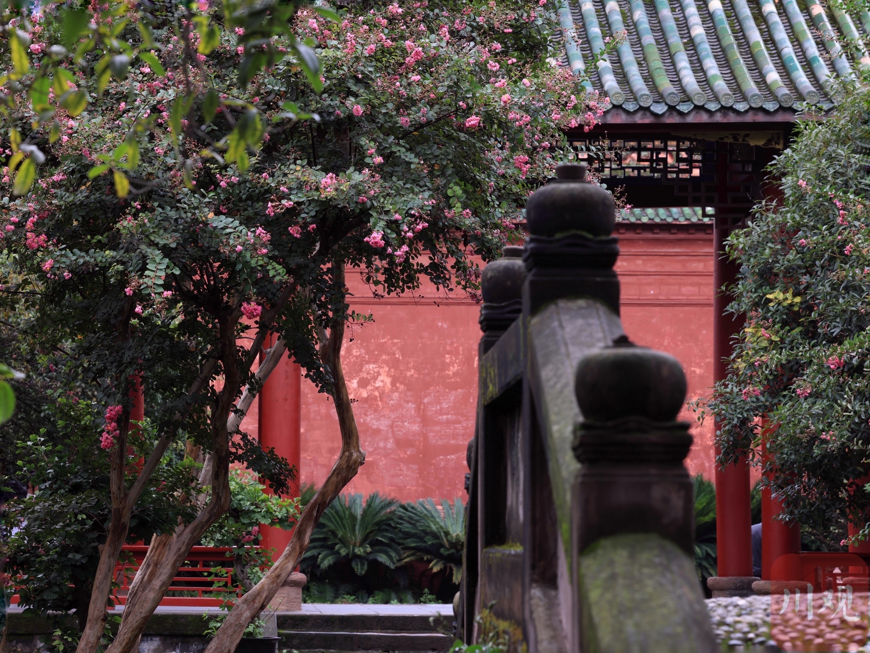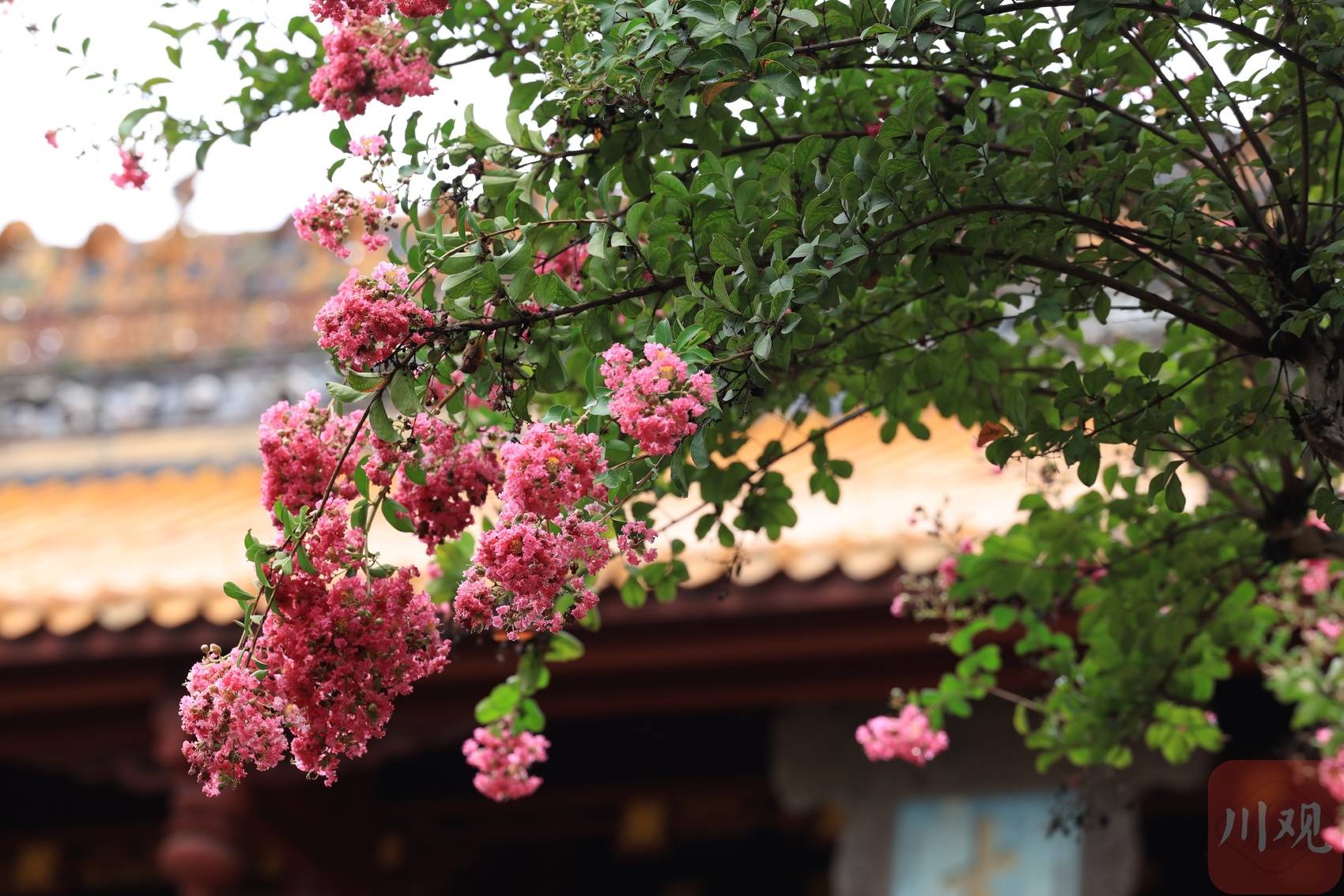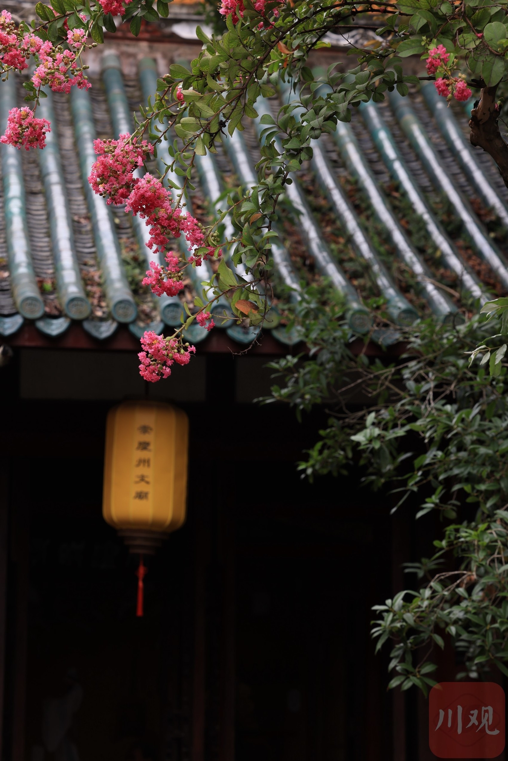 初秋季节,在崇州市城区的千年古园罨画池内,紫薇花正竞相绽放。繁花密缀,明艳如霞,随风徜徉,顾盼生姿。当园内的古建筑与紫薇相遇,木质的素朴,叠檐飞拱的雄壮,雕梁画栋的精美,与飞霞流丹的紫薇花相衬相映,一幅诗意的画卷便徐徐展开。不妨趁着晴好天气,走进罨画池,赴一场紫薇花之约!