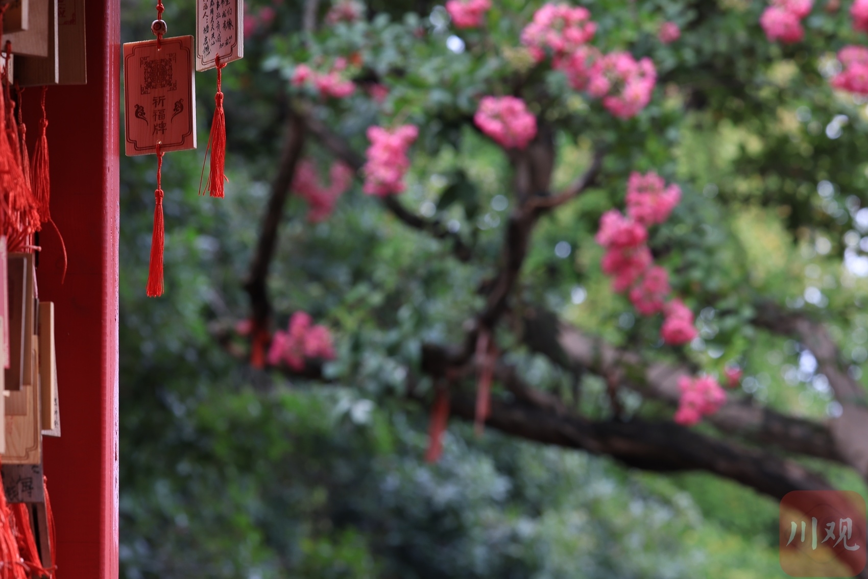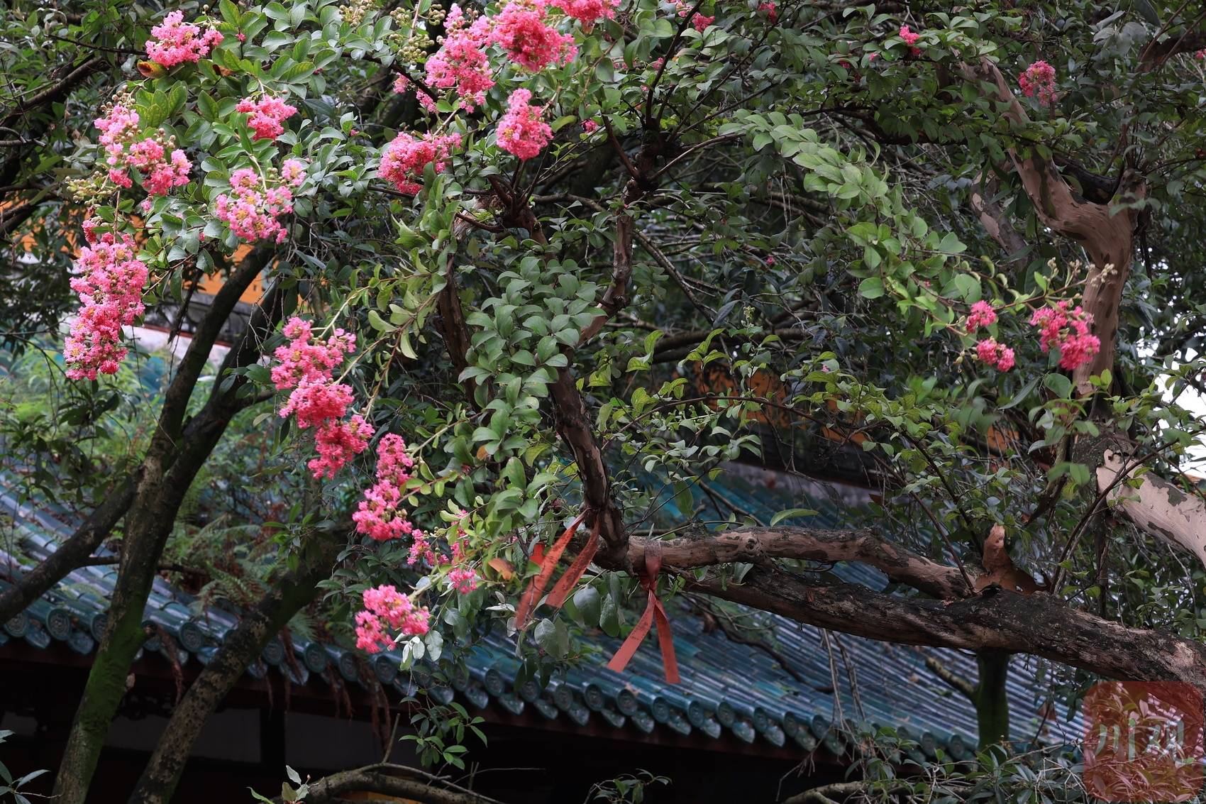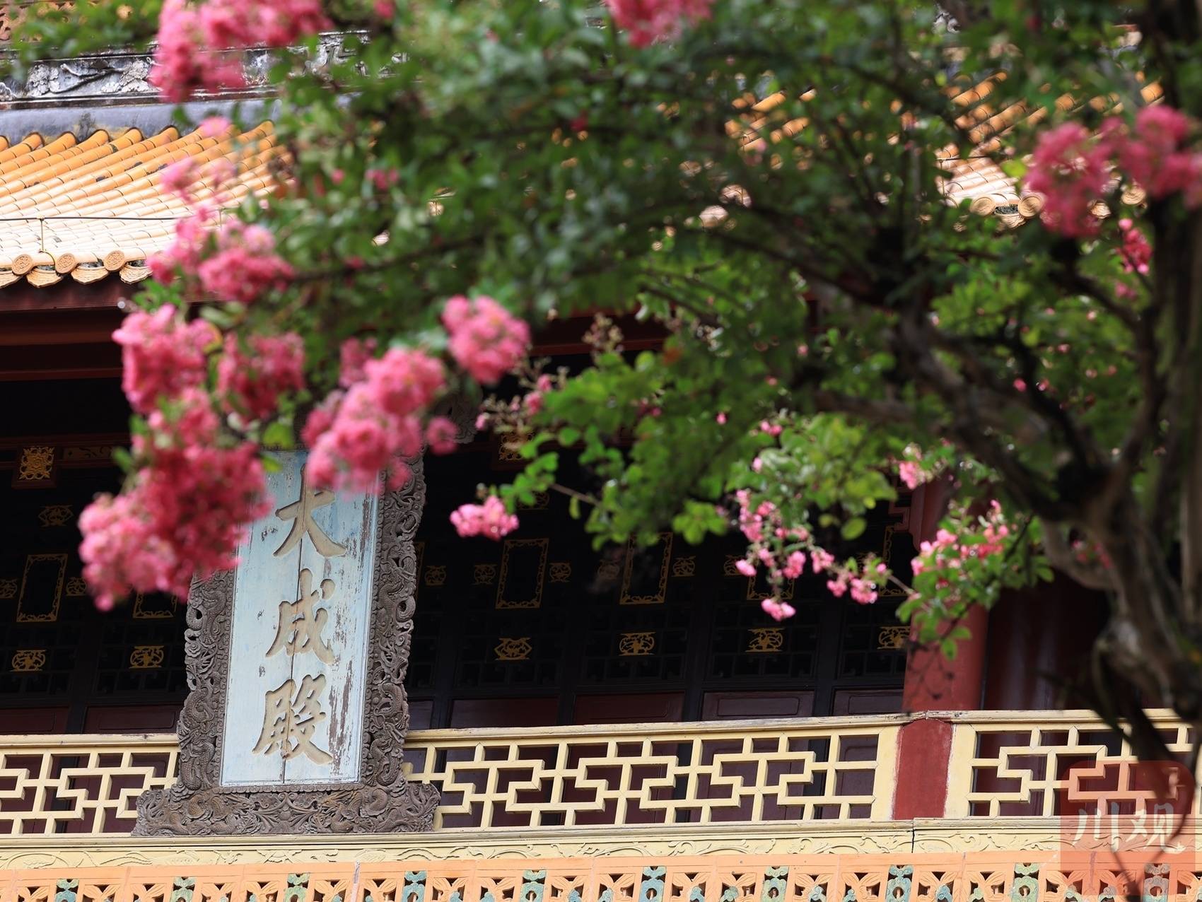 初秋季节,在崇州市城区的千年古园罨画池内,紫薇花正竞相绽放。繁花密缀,明艳如霞,随风徜徉,顾盼生姿。当园内的古建筑与紫薇相遇,木质的素朴,叠檐飞拱的雄壮,雕梁画栋的精美,与飞霞流丹的紫薇花相衬相映,一幅诗意的画卷便徐徐展开。不妨趁着晴好天气,走进罨画池,赴一场紫薇花之约!