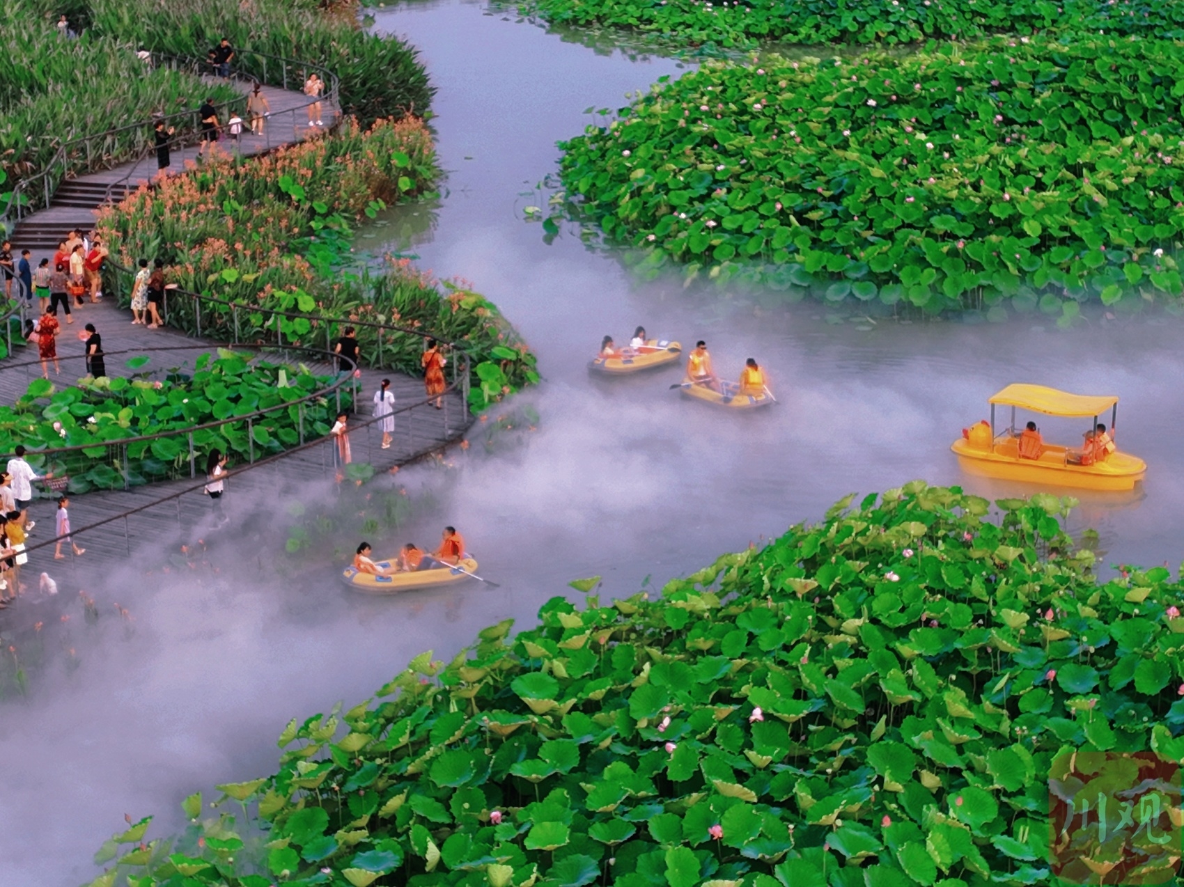 在崇州市隆兴镇群安村,连片的荷塘,在夕阳的余晖中显得格外摇曳多姿。从盛夏到入秋,每天傍晚都有不少游人划着小船,穿行在荷塘深处,俨然一幅美丽的田园风光图,“人在画中,田在景中”。