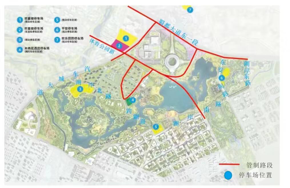 2、场馆周边其它停车场:欢乐田园停车场、湖岸北路临时停车场、东安湖公园地面停车场、木棉花酒店停车场、平安临时停车场、主媒体中心停车场、东安湖南广场停车场等。