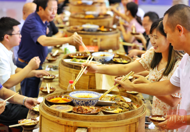 时间来到2个小时后,伴随着特色的“‘九斗碗’开席啰!”鸣堂叫菜声,盛着郫县豆瓣鱼、咸烧白、东坡肘子等菜肴的一格格蒸笼,被端上长桌。桌边满满当当的饕客,迫不及待地开始这餐美味佳肴。袅袅炊烟升起,消费活力跃动。