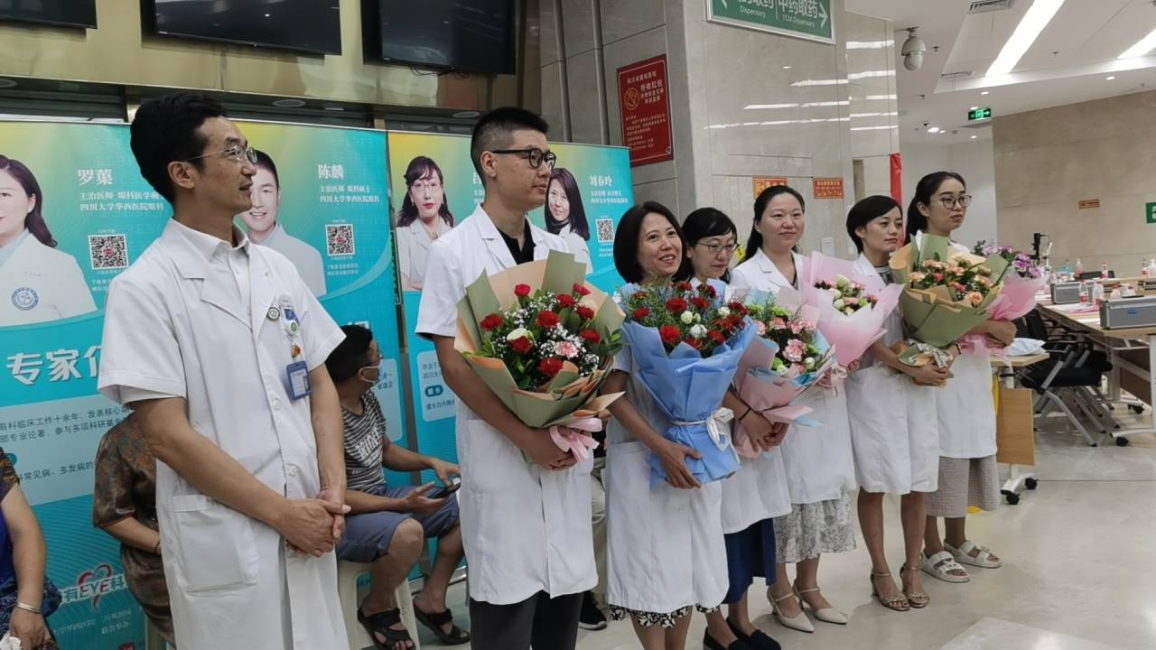 四川省建筑医院党委书记李兵(左一)代表医院向参与义诊咨询活动的华西眼科专家致谢