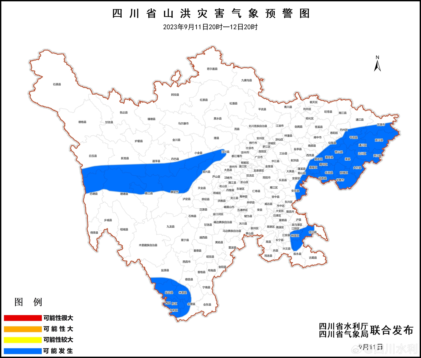 2023年9月11日20时至12日20时,巴中市巴州、通江、平昌,宜宾市兴文,达州市通川、达川、宣汉、开江、大竹、渠县、万源,凉山州盐源、德昌、会理,遂宁市船山、安居、蓬溪,攀枝花市东区、西区、仁和、米易、盐边,广安市广安、前锋、岳池、武胜、邻水、华蓥,资阳市安岳,南充市顺庆、高坪、嘉陵、南部、营山、蓬安、仪陇、西充,甘孜州康定、泸定、丹巴、雅江、道孚、新龙、白玉、理塘、巴塘,泸州市江阳、纳溪、合江、叙永,阿坝州汶川、小金,雅安市宝兴等53个县(市、区)可能发生山洪灾害。