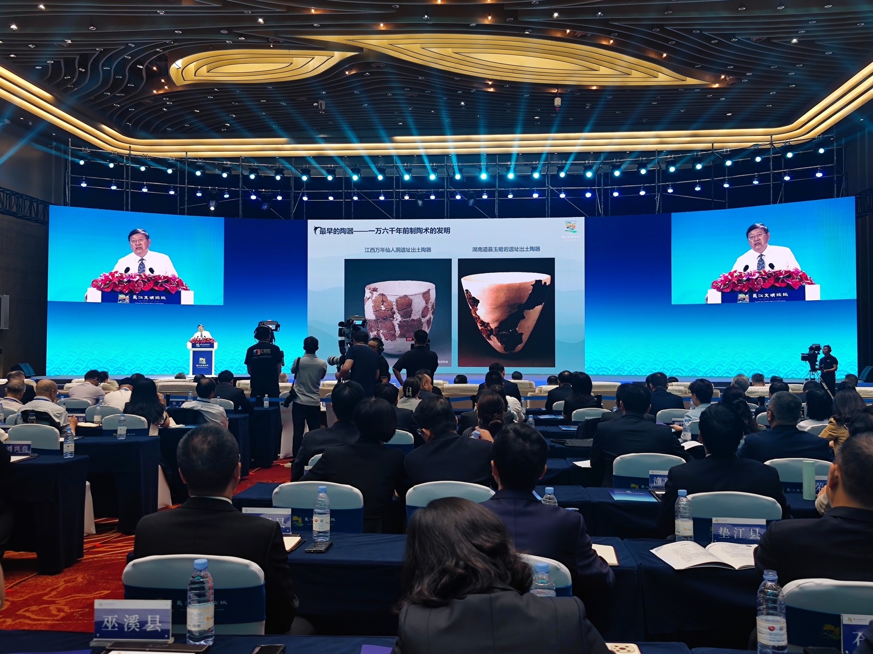 王巍举例,这里有最早的陶器,江西万年仙人洞遗址出土陶器、湖南道县玉蟾岩遗址出土陶器就是最好的例证;有最早的人工栽培稻,湖南道县玉蟾岩遗址中两次发掘中均发现有稻谷遗存,经专家鉴定为栽培种,是目前世界上发现最早的人工栽培稻标本,这刷新了人类最早栽培水稻的历史纪录;最早的随葬陶器墓、彩陶和的书写符号,则发现于浙江义乌桥头遗址居住址和墓葬,距今9000—8500年前;最早的白陶和七千年前的神与祭祀,则可以在湖南怀化高庙遗址寻得;还有最早的太阳与人的图像——距今七千年前城背溪文化“太阳人”石刻。王巍解释,这些图像或影响着后来的三星堆文化、金沙文化;距今七千年前河姆渡遗址的水稻田,则是长江流域最早的水田;最早的太阳鸟形象,是距今7000年前的双鸟驮日图像;最早的史前古城则是湖南澧县距今6000年前的城头山遗址;长江下游地区最早进入文明社会的遗址是安徽含山凌家滩遗址,距今约5500—5300年前。