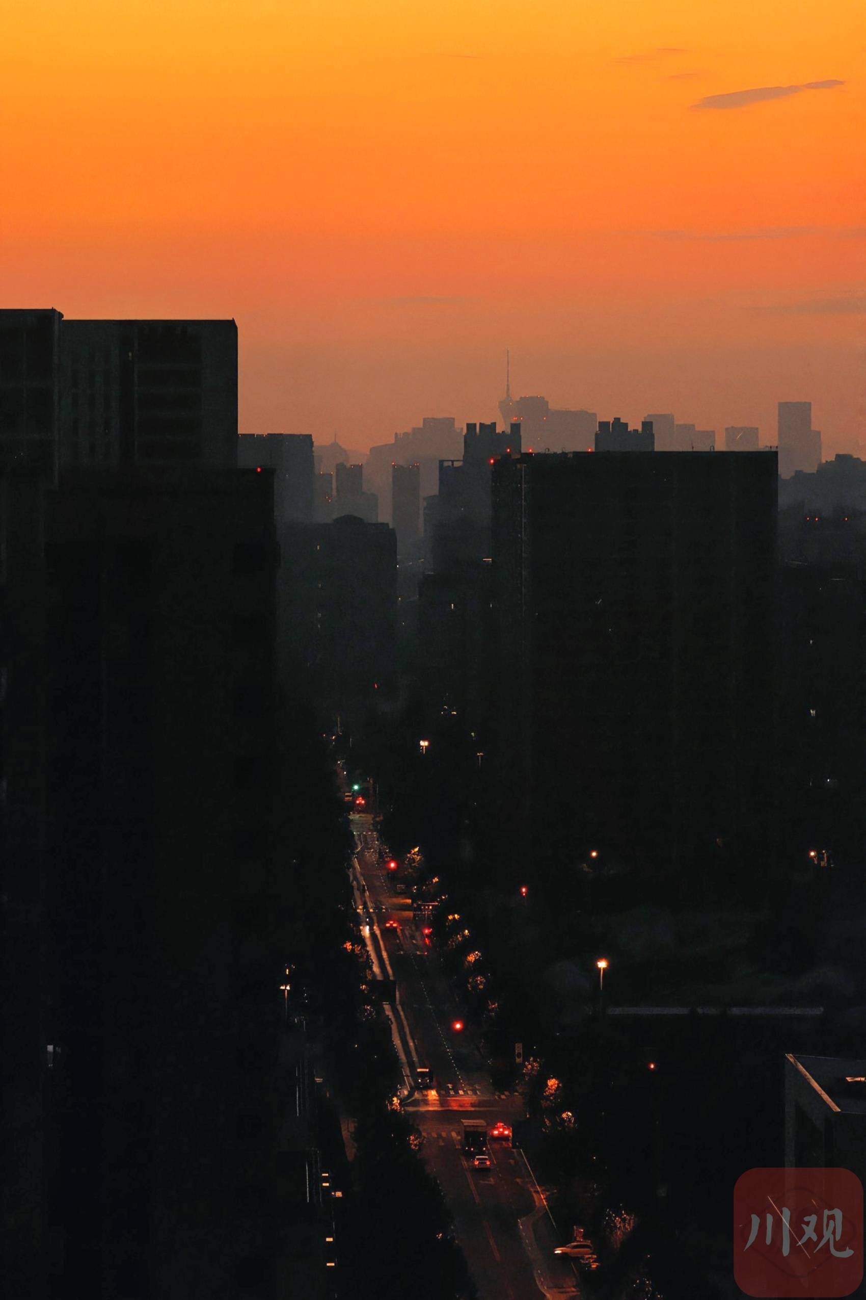 9月13日清晨,成都市区的天空晴朗通透,6点半左右,C视觉摄影师在成都市光华大道青羊段拍摄到,红彤彤的朝阳将整座城市唤醒,霞光漫天如同一幅鲜艳的油画,美不胜收。