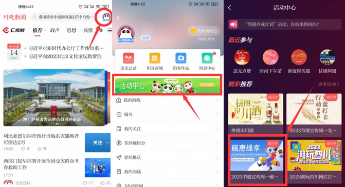 【第二步】在川观新闻首页,“我的”版块,点击“活动中心”,找到“2023四川省公共机构节能宣传周”活动图片,点击参与活动。
