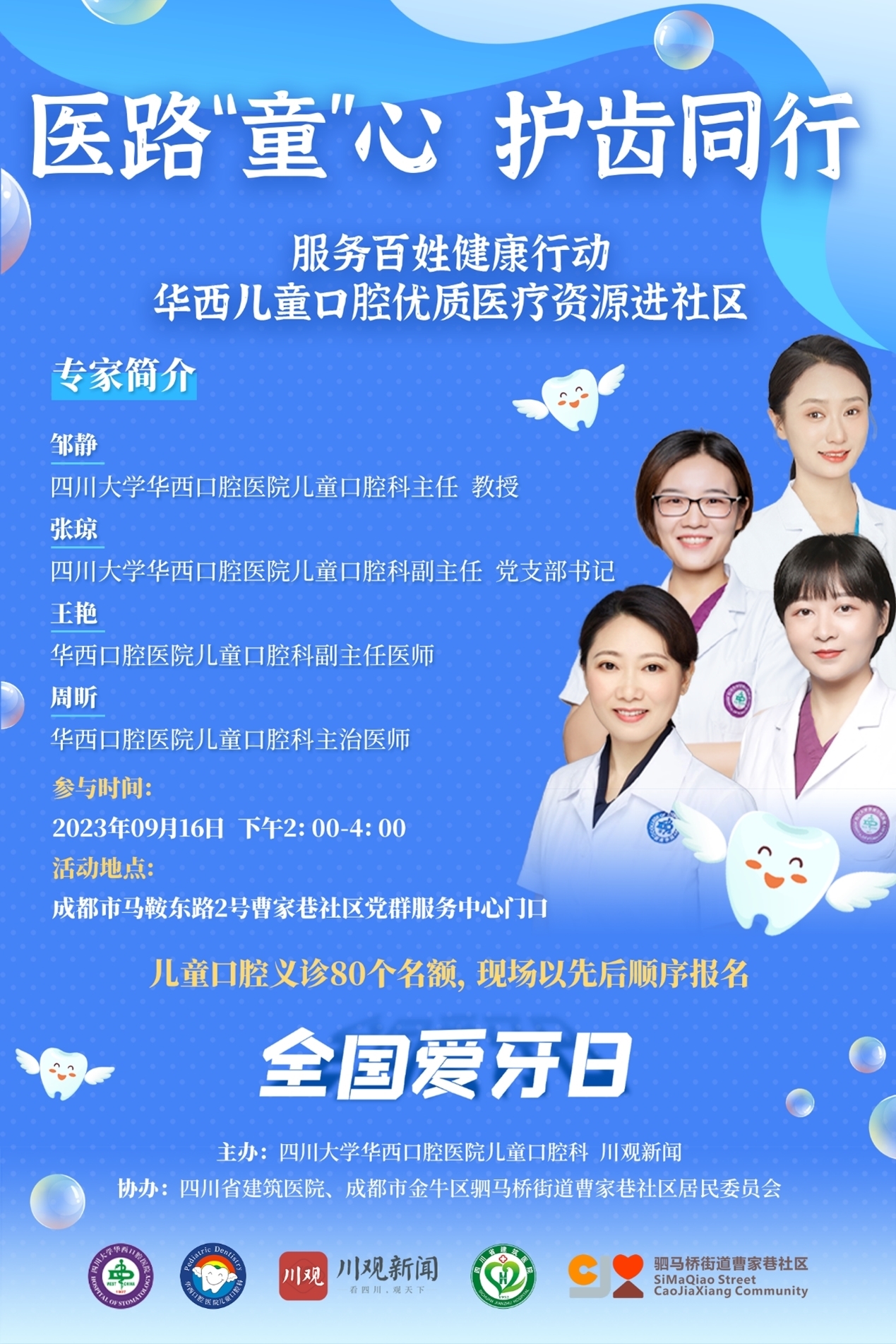 为响应国家卫健委关于开展2023年“服务百姓健康行动的倡议,在9·20全国爱牙日来临之际,9月16日下午,川观新闻拟联合国家口腔医学中心·四川大学华西口腔医院儿童口腔科,在成都市金牛区驷马桥街道曹家巷社区居民委员会开展“服务百姓健康行动——华西口腔优质医疗资源进社区”义诊活动,被称为“邹儿牙”的国内著名儿童口腔科专家、国家临床重点专科华西儿童口腔科主任邹静教授将带领团队组成国内一流的儿童口腔“重量级”义诊团队。此次义诊中,儿童口腔健康档案将首次进入社区,并逐步在各社区实现健康“童”行,预计覆盖五大社区九万余居民。
