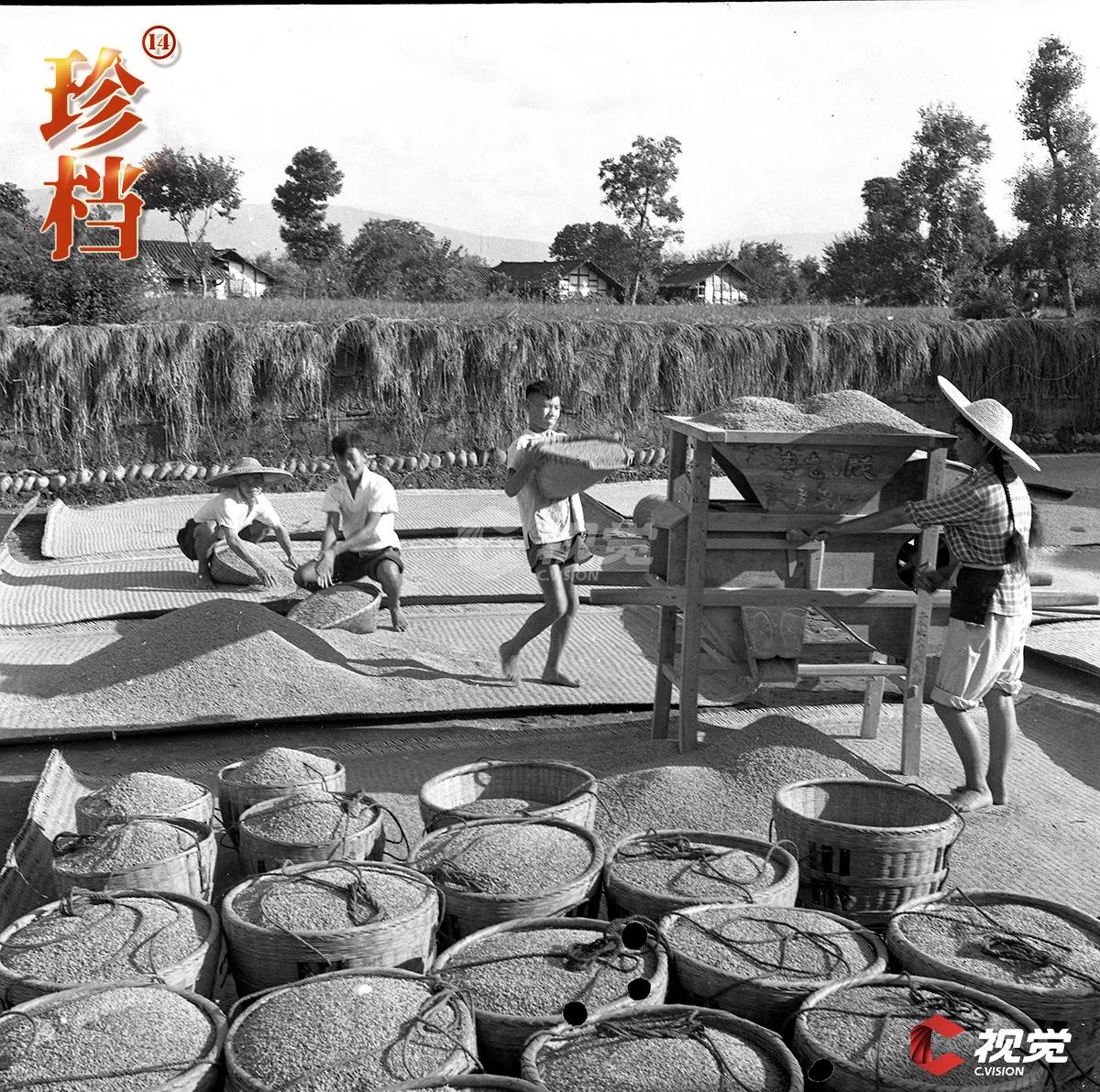 1959年,郫县红光公社幸福管区社员在晾晒入仓公粮。