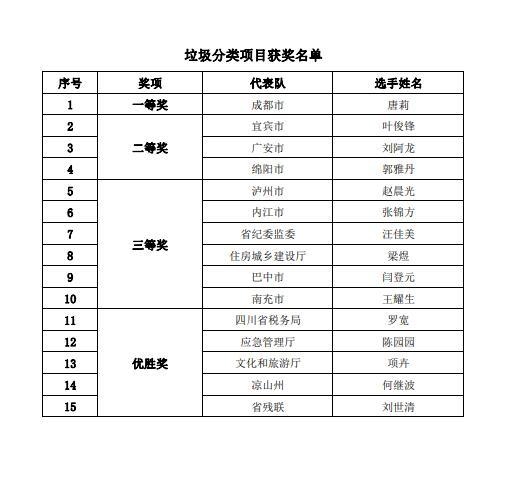 据了解,大赛组委会将为获得本次竞赛第一名且符合条件的选手,推荐申报四川省“五一劳动奖章”、“四川省技术能手”称号;为垃圾分类项目中获得一、二等奖的选手,推荐申报“四川省生活垃圾分类达人”称号。获得一、二等奖的选手还将入选四川省机关服务技能工匠人才库和全国机关服务技能大赛四川集训队。