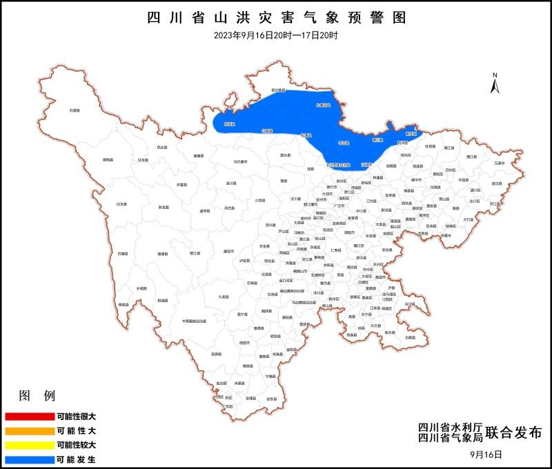 今日17时,四川省水利厅联合四川省气象局发布山洪灾害蓝色预警,预警显示,2023年9月16日20时至17日20时,广元市利州、朝天、青川,绵阳市北川、平武、江油,阿坝州松潘、九寨沟、阿坝、若尔盖、红原等11个县(市、区)可能发生山洪灾害。
