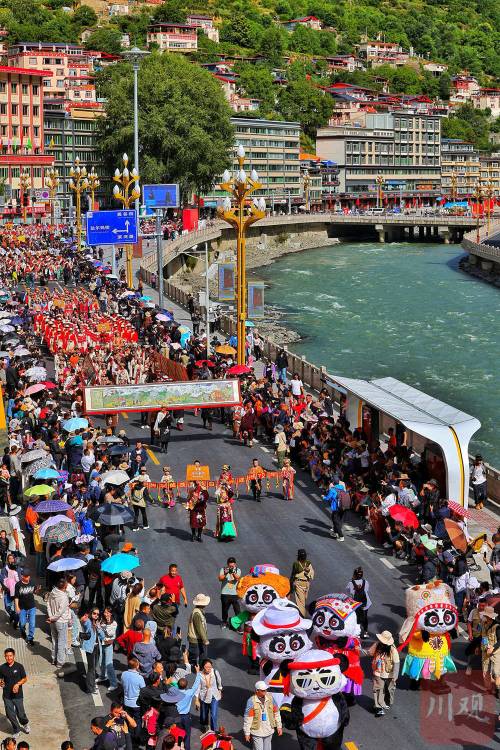 9月15日下午,马尔康市主城区热闹非凡,来自全州的千人非遗巡游方队依次走上街头,伴着欢快的音乐、跳起轻快的舞步、弹响特色的曲调,梭磨河两岸,巡游队伍和市民汇成欢乐的海洋。